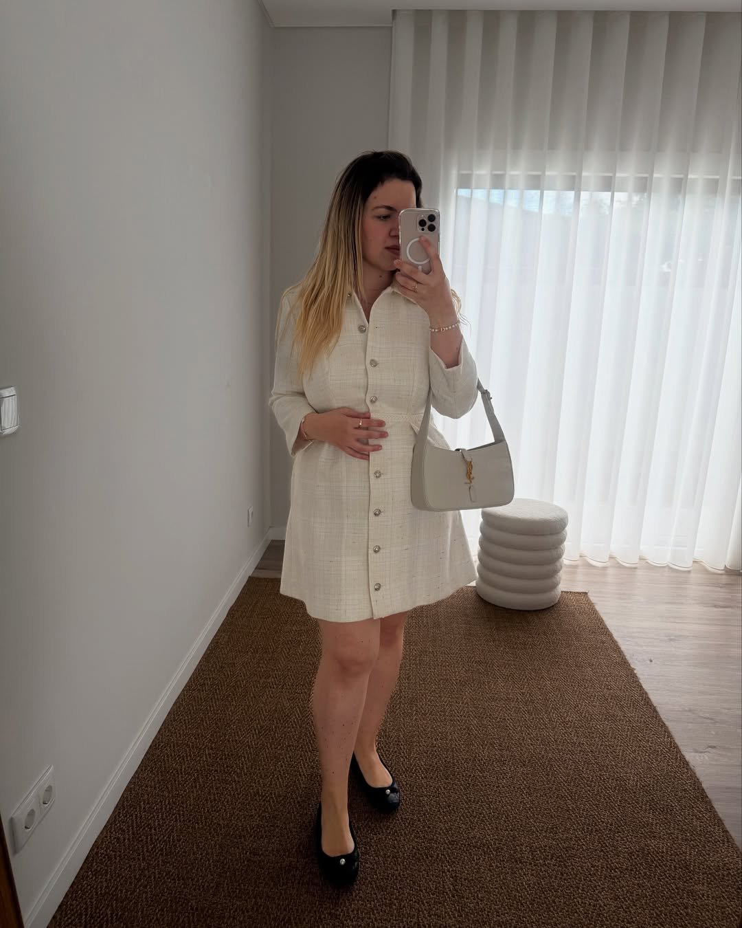 This outfit proves that neutrals can still feel rich. The cream-toned button dress is clean, minimal, and super flattering, giving that “quiet luxury” vibe without needing anything extra.