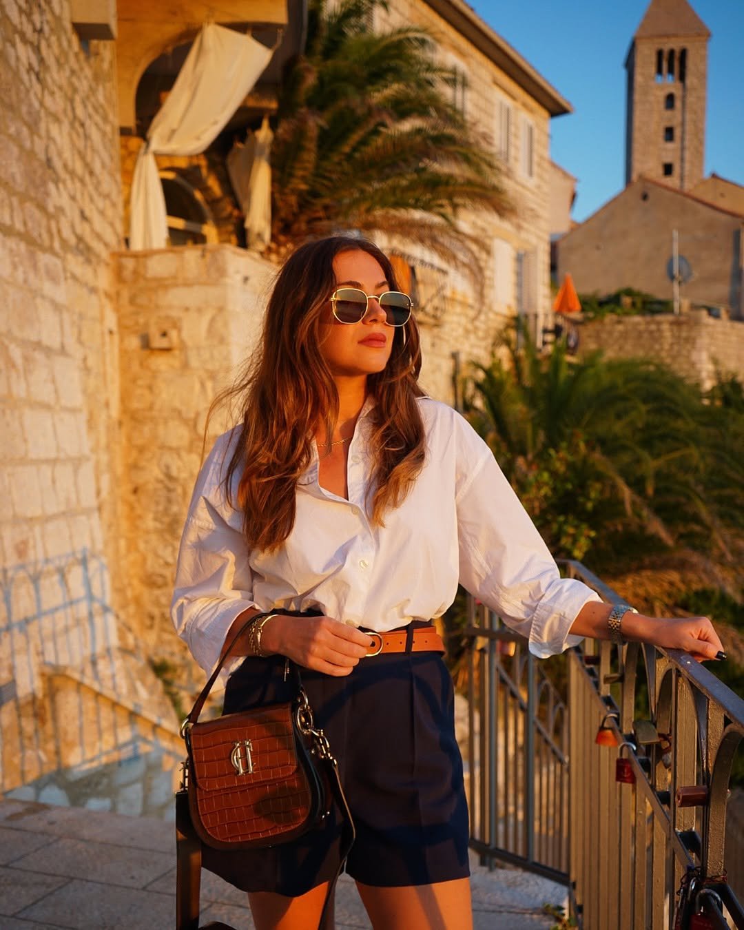 This look feels like a sunset in the south of France—warm, effortless, and just a little bit cinematic. The crisp white shirt tucked into tailored navy shorts is already a timeless combo, but that rich brown belt and structured bag bring in depth that makes it feel elevated.