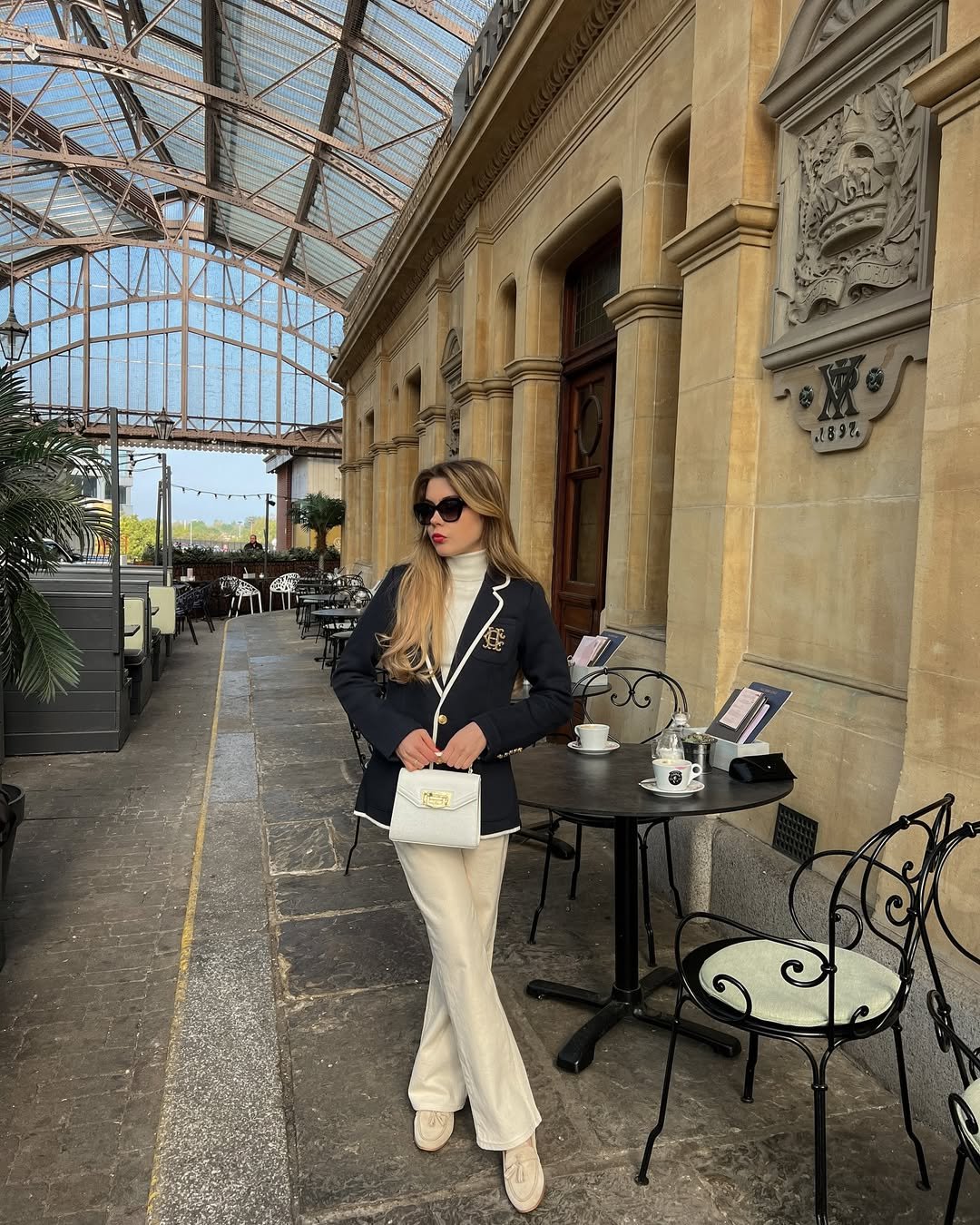 This look is pure old money elegance. The structured navy blazer with gold detailing layered over a neutral base instantly gives that refined, almost aristocratic vibe. It’s tailored, sharp, and incredibly put together.