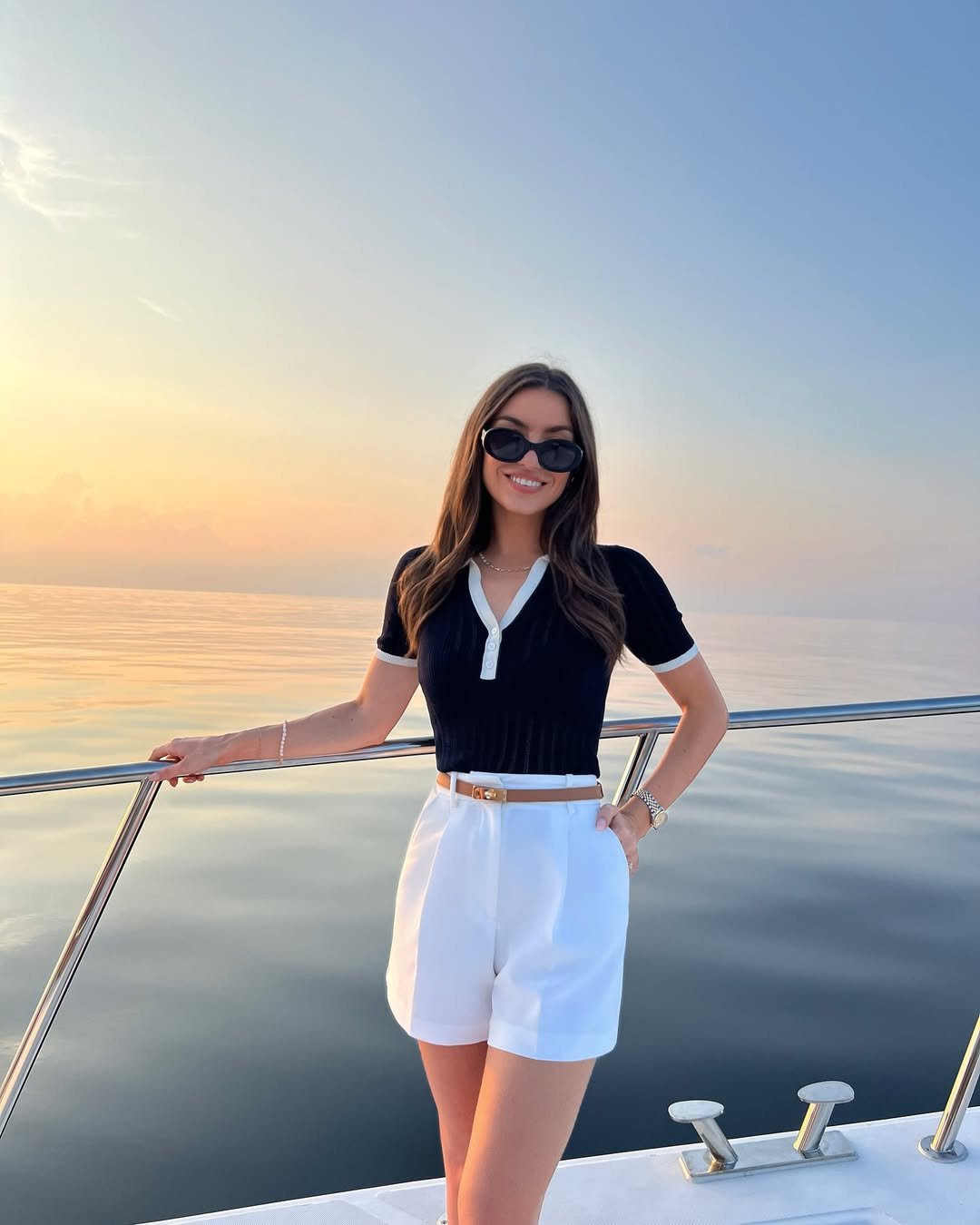 This one is clean, crisp, and straight out of a coastal summer dream. The black short-sleeve knit with white trim tucked into tailored white shorts gives that classic yacht-club aesthetic without trying too hard.