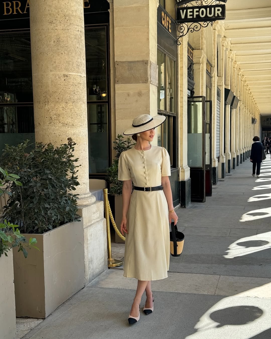 This one is timeless in the most literal sense. The soft beige dress with delicate buttons, cinched neatly at the waist, feels like something that will never go out of style. Paired with that wide-brim hat, it leans fully into that refined Parisian aesthetic.