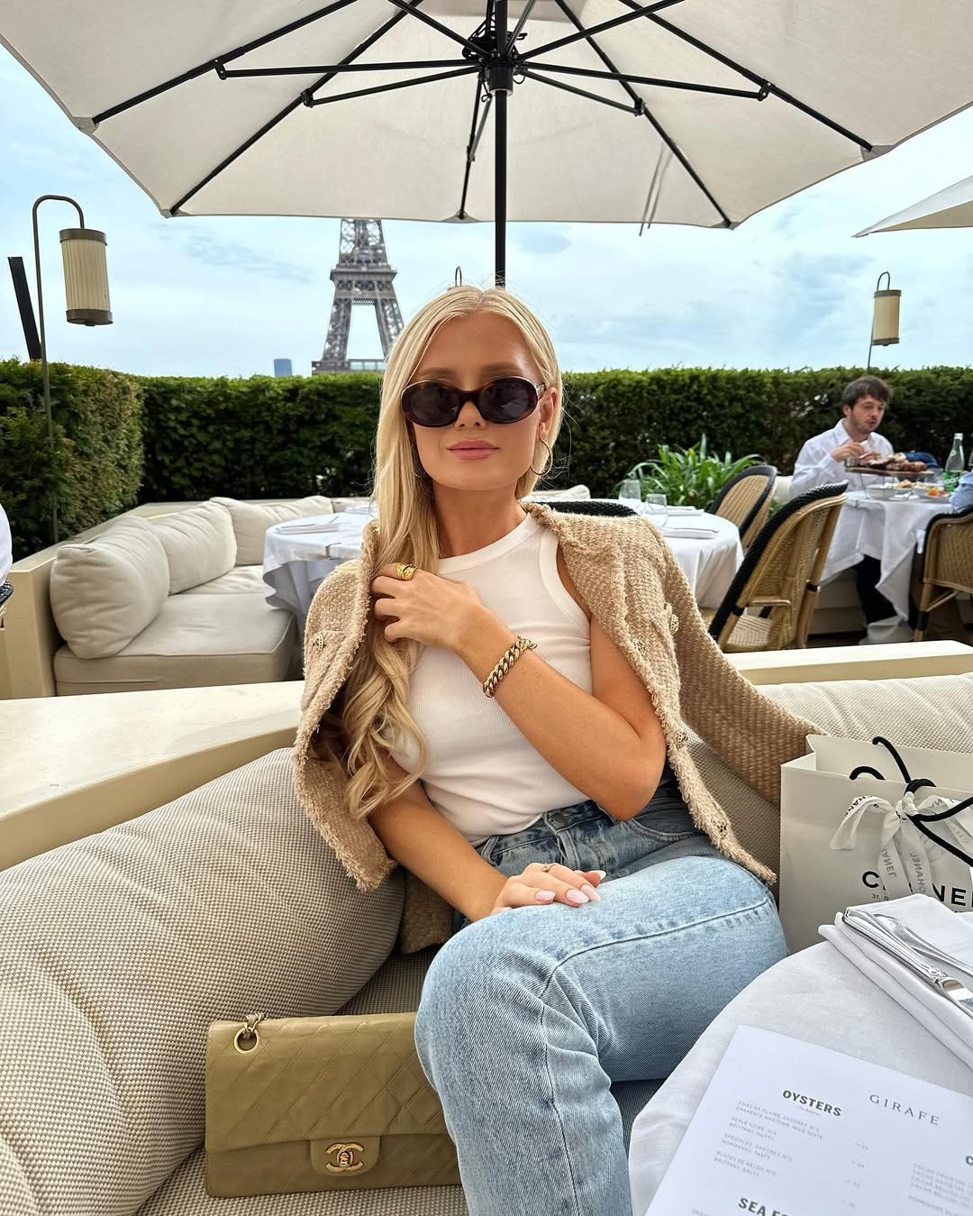 And then you notice the details—the gold jewelry, the classic handbag, the setting. It’s giving “I just stepped out for lunch near the Eiffel Tower,” and honestly, the outfit lives up to the location.