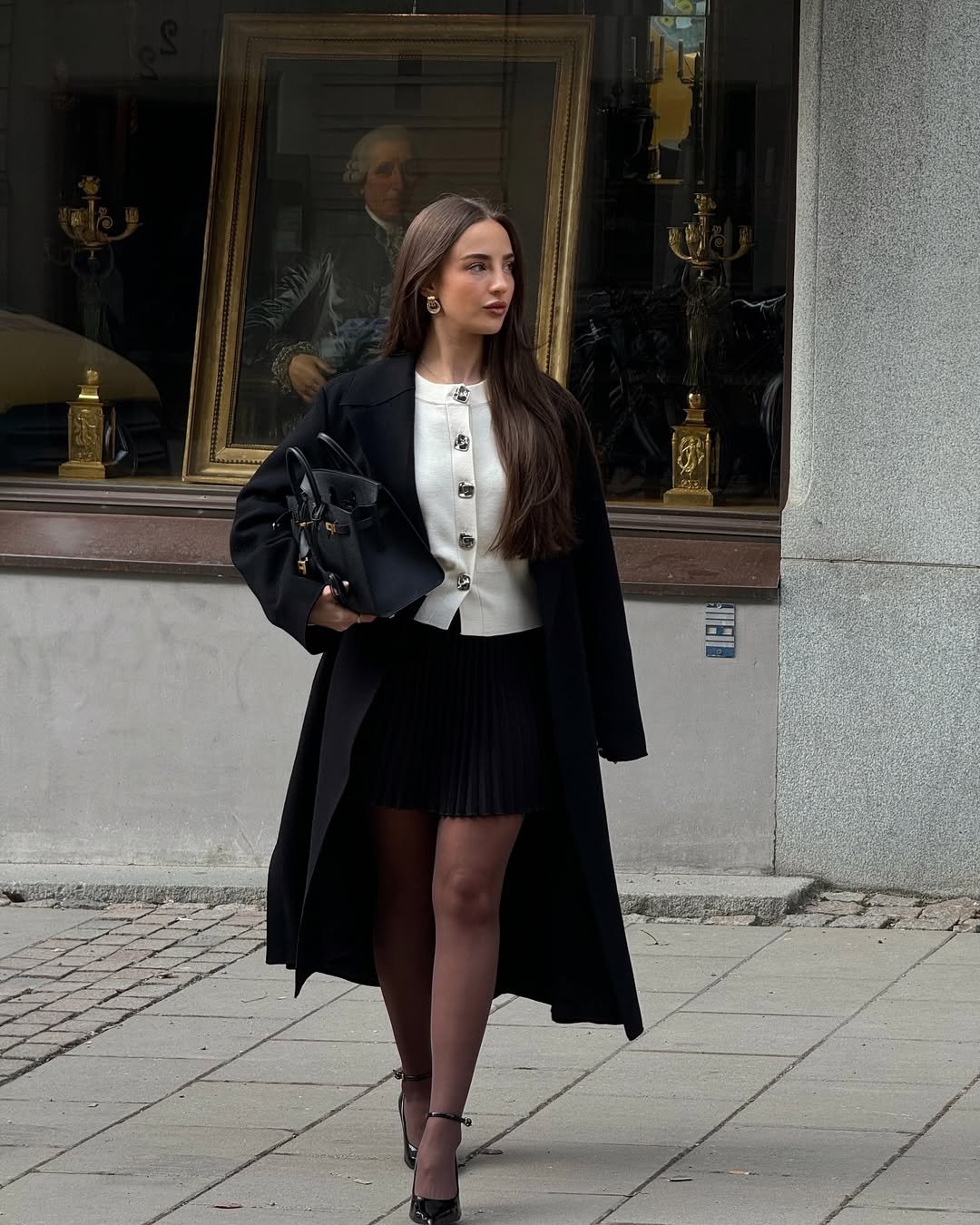 This look is sharp, feminine, and quietly powerful all at once. The structured black coat layered over a cream buttoned top and pleated mini skirt creates that perfect balance between polished and playful. It’s giving “walk into a meeting, then straight to a café” energy.