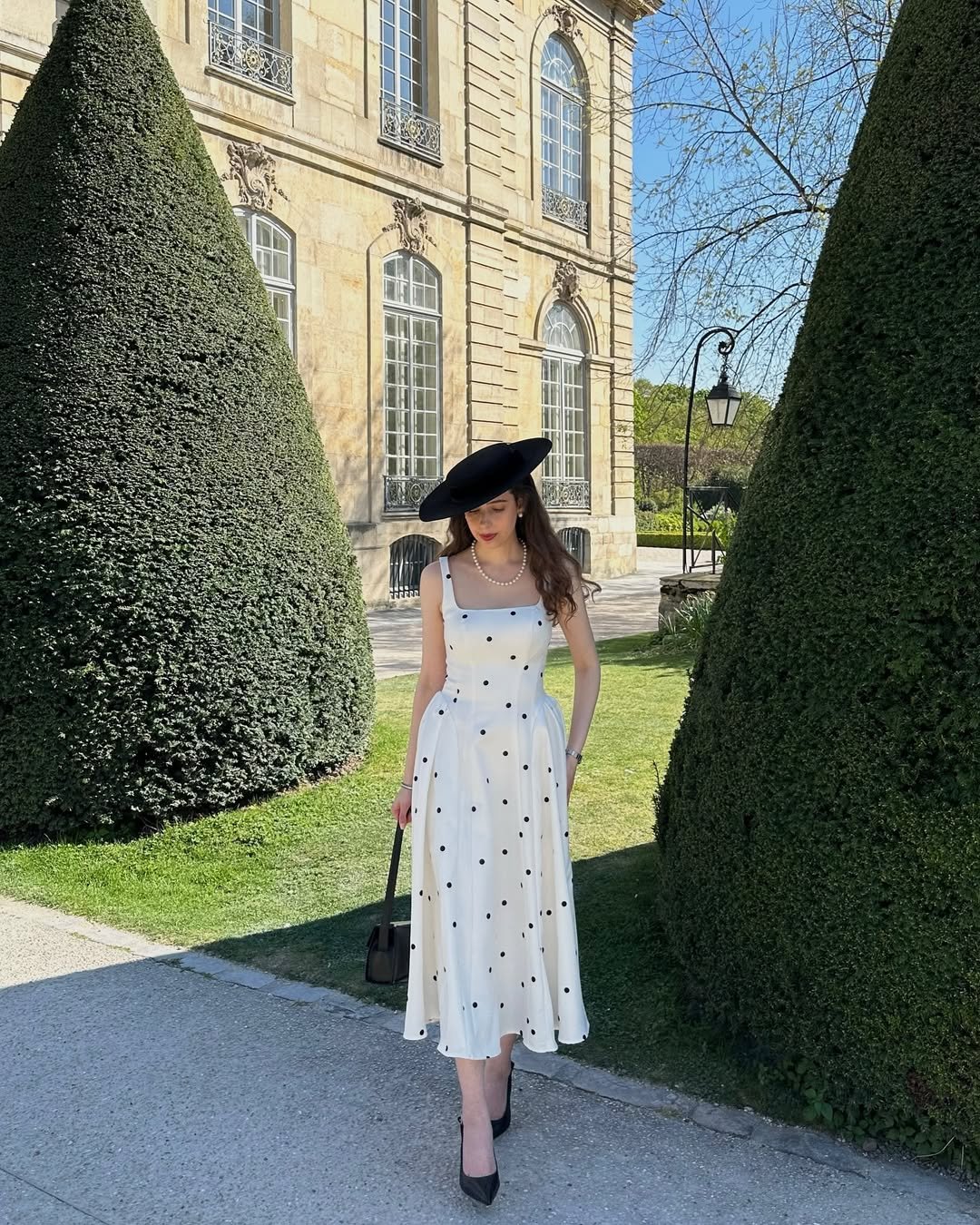 This outfit feels like a scene from a timeless film. The white dress with delicate black polka dots, paired with a structured hat and pearls, creates that vintage elegance that never goes out of style.