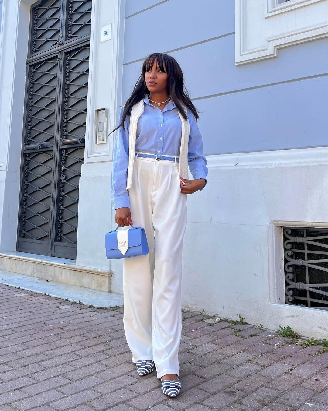 This look is all about soft tones done right. The light blue shirt tucked into high-waisted cream trousers creates that airy, polished silhouette that feels both fresh and timeless.