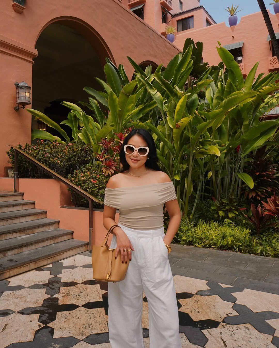 This outfit feels like a warm, tropical escape. The off-shoulder neutral top paired with crisp white trousers creates that relaxed yet refined silhouette that’s perfect for vacation days.