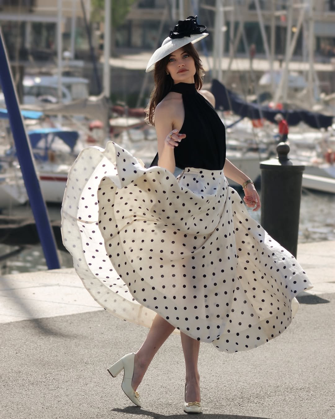 This look feels straight out of a vintage film set on the coast. The halter-style black top paired with that flowing polka dot skirt creates movement that’s impossible to ignore—it’s soft, dramatic, and effortlessly feminine. And that statement hat? It just seals the whole old-money fantasy.