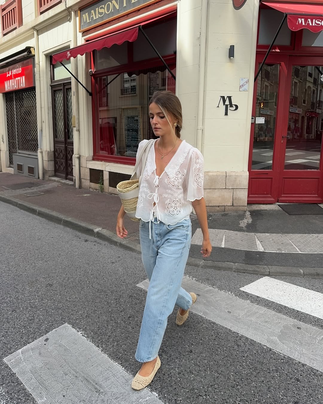 This outfit feels like a slow morning in a small French town. The delicate white blouse with subtle embroidery paired with light-wash denim is effortlessly romantic, but still grounded and wearable.