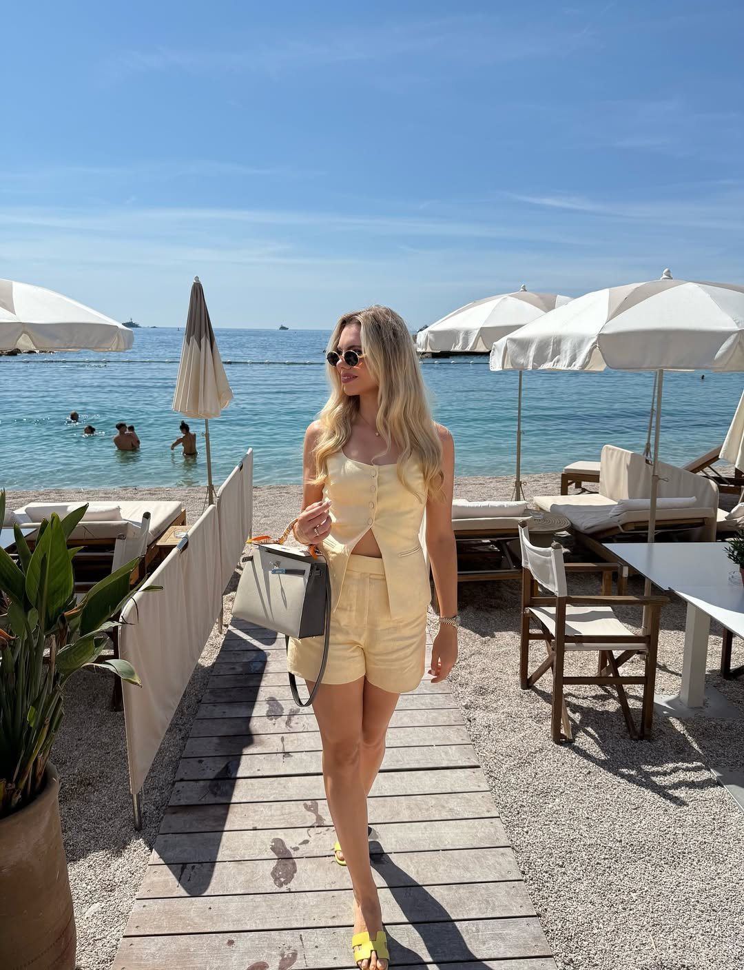 This outfit is sunshine in clothing form. The pale yellow matching set feels fresh, light, and perfectly tailored for a seaside day. It’s minimal, but the coordination makes it feel instantly elevated.