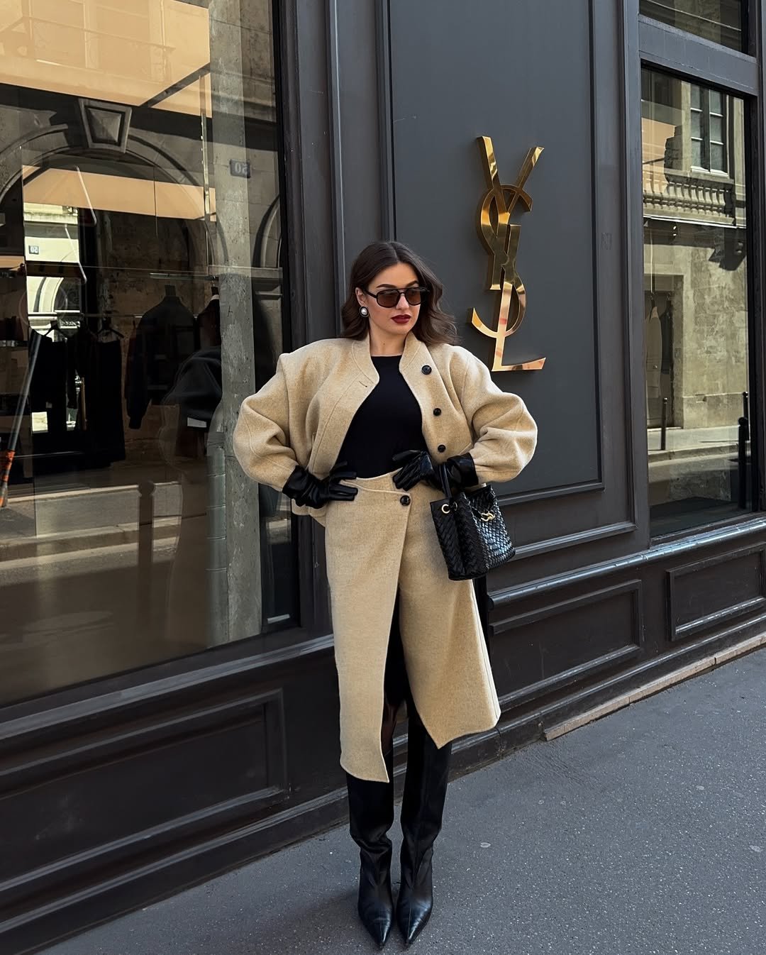 This look is strong, structured, and very city-chic. The camel-toned coat layered over a black base creates that bold contrast that instantly feels expensive and elevated.