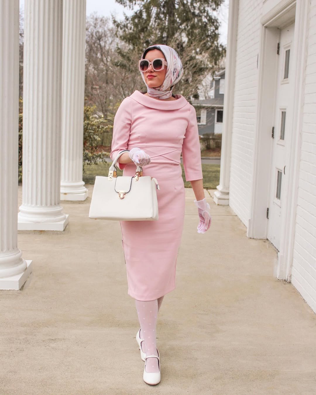 This outfit feels like stepping into another era—in the best way. The soft pink fitted dress with gloves and a silk scarf channels that classic, ladylike aesthetic that never really goes out of style.
