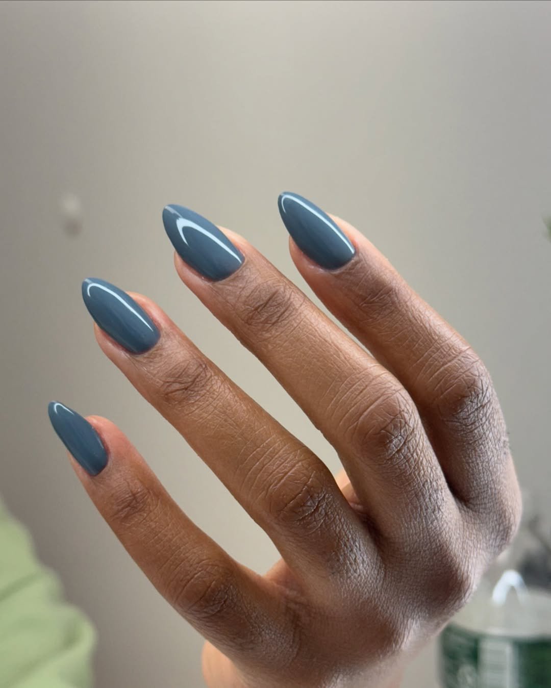 This muted slate-blue manicure feels calm, modern, and effortlessly stylish. The almond shape gives it a sleek look, while the glossy finish keeps the color looking smooth and polished.