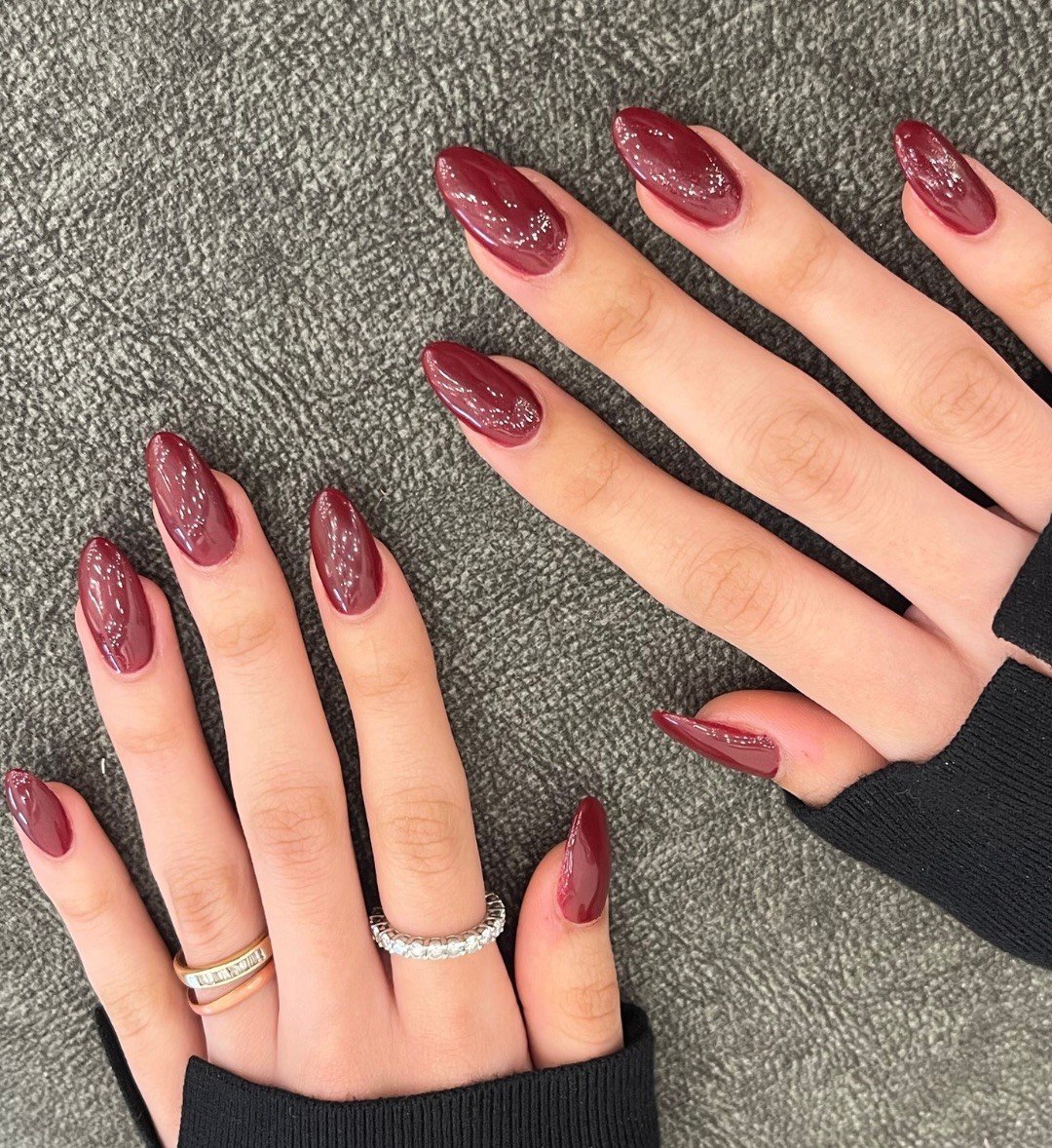 There’s something about a rich burgundy manicure that instantly feels powerful. This deep red shade has that subtle shimmer running through it, giving the nails a dimensional glow instead of a flat color. The almond shape keeps everything sleek and elegant, making the whole set feel polished and confident.