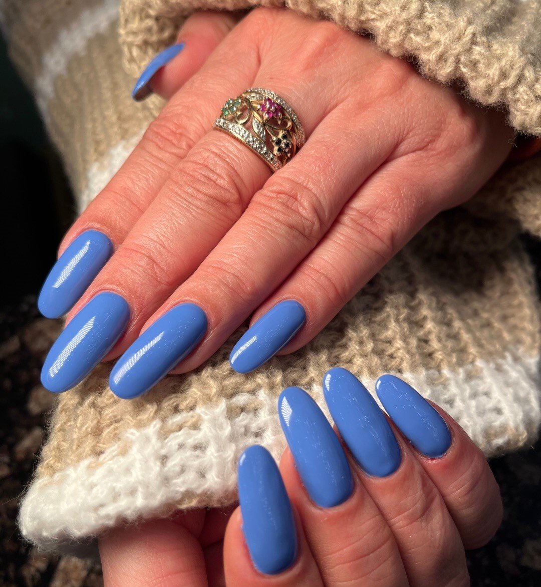 If you’re craving a color that feels fresh but still simple, this soft cornflower blue is such a standout choice. The glossy finish makes the shade pop even more, especially with the long oval shape that adds a little drama.