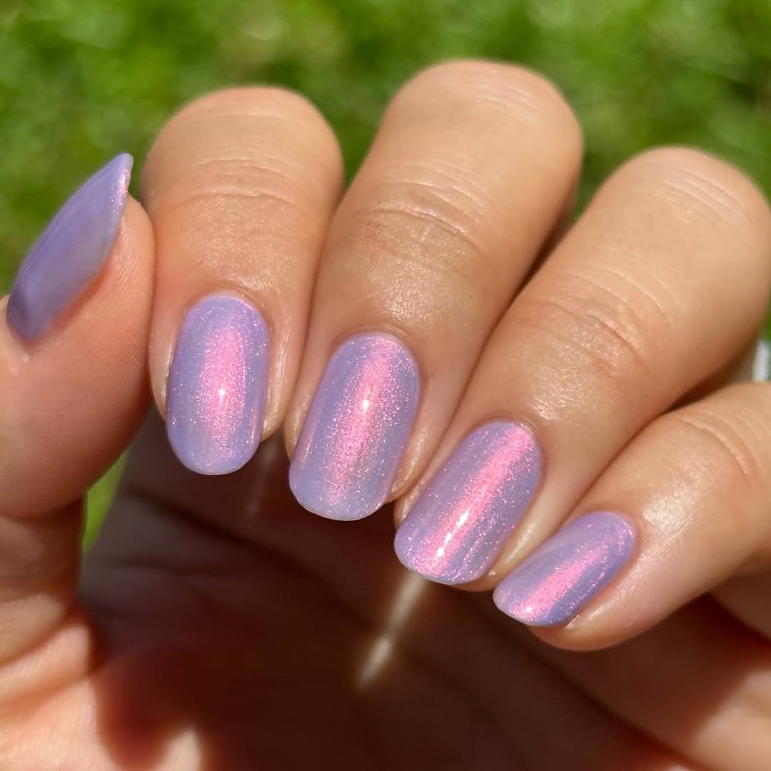 This dreamy lavender shade has a subtle shimmer that shifts beautifully in the light. The chrome-like glow gives the nails a magical, almost ethereal look while still staying within that one-color theme.