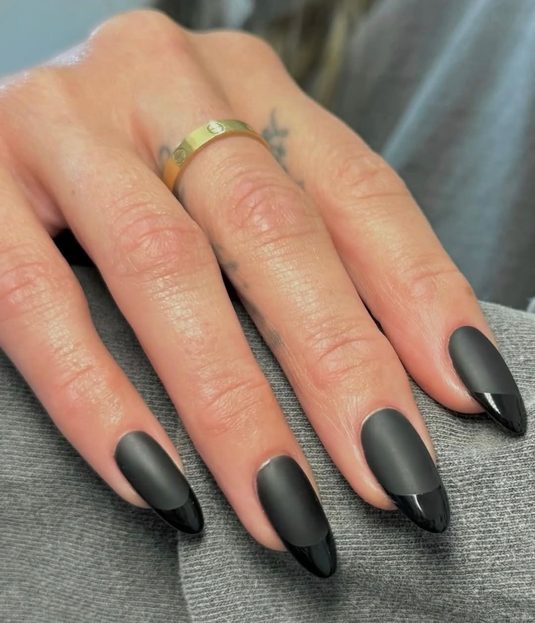 It’s minimal but still edgy, like the nail version of an all-black outfit that somehow never looks boring. If you love dark nails but want something a little more interesting than a plain polish, this matte-and-gloss combo hits the sweet spot.
