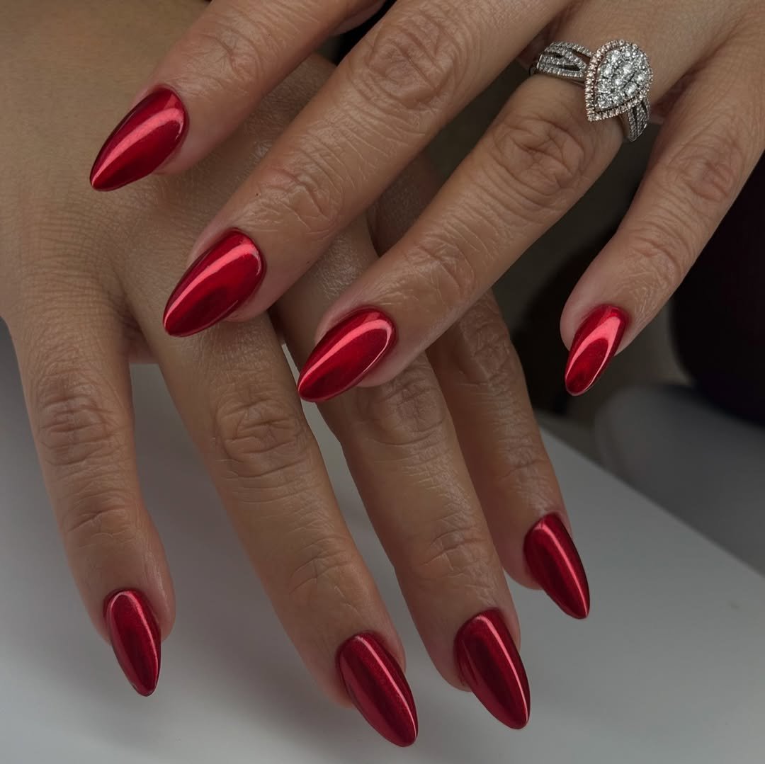 If drama had a manicure, this would be it. The bold red chrome finish creates that reflective, mirror-like shine that instantly makes the nails look futuristic and glamorous.
