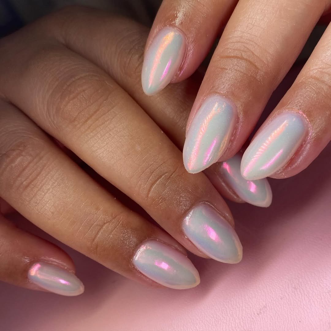 These opal chrome nails look almost magical. The milky white base reflects hints of pink and iridescent tones, creating that soft rainbow effect depending on the angle.