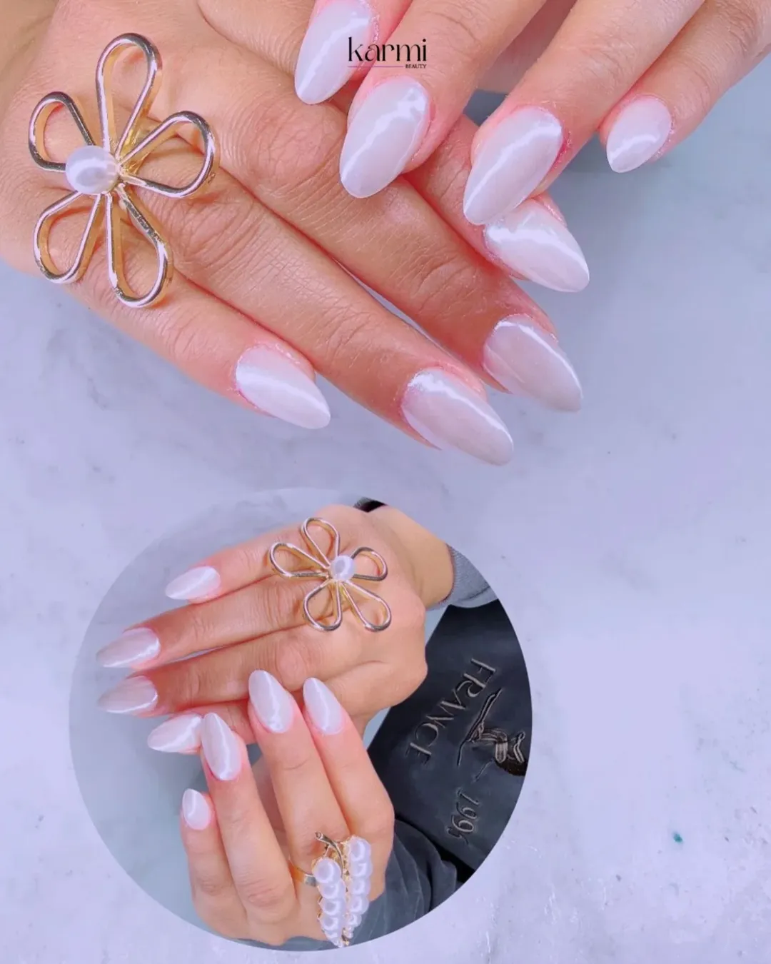 This pearly white manicure feels soft, luminous, and incredibly elegant. The subtle shine gives the nails a delicate glow, almost like a pearl catching the light.