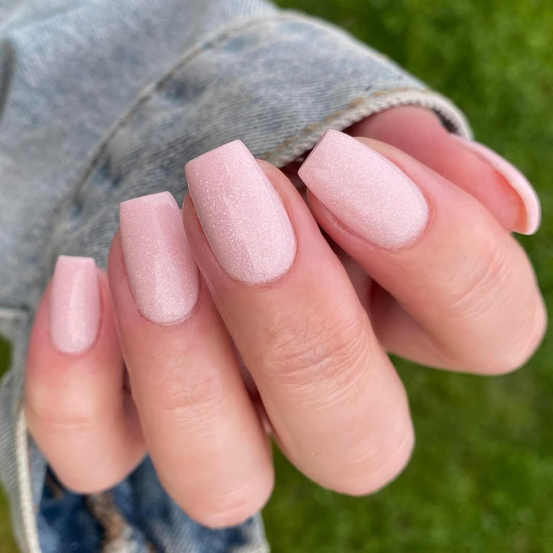 This soft blush manicure has the prettiest hint of shimmer running through it. The square shape keeps the nails looking clean and structured, while the delicate sparkle adds a subtle glow.