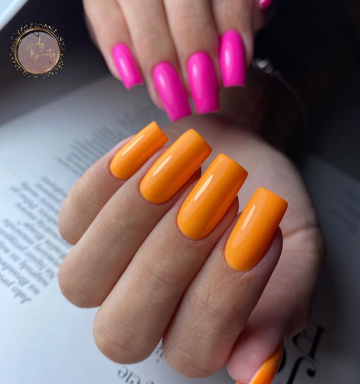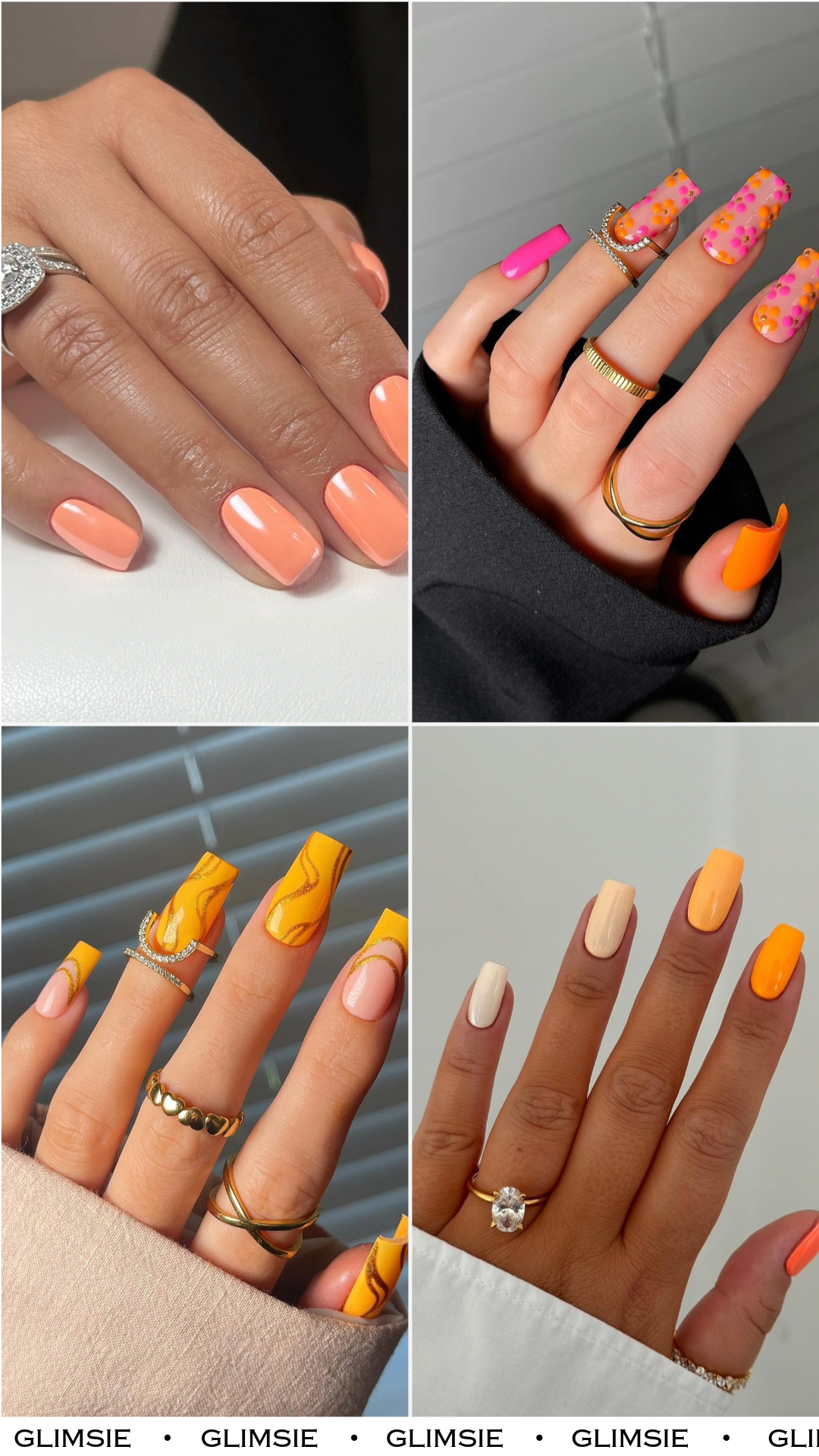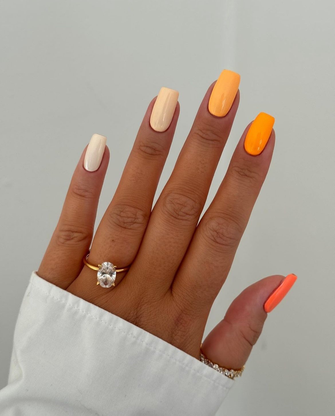 This manicure brings together soft creams, warm oranges, and bright citrus tones in a clean gradient-inspired palette. Each nail features a slightly different shade, creating that perfect “mix but still cohesive” look.