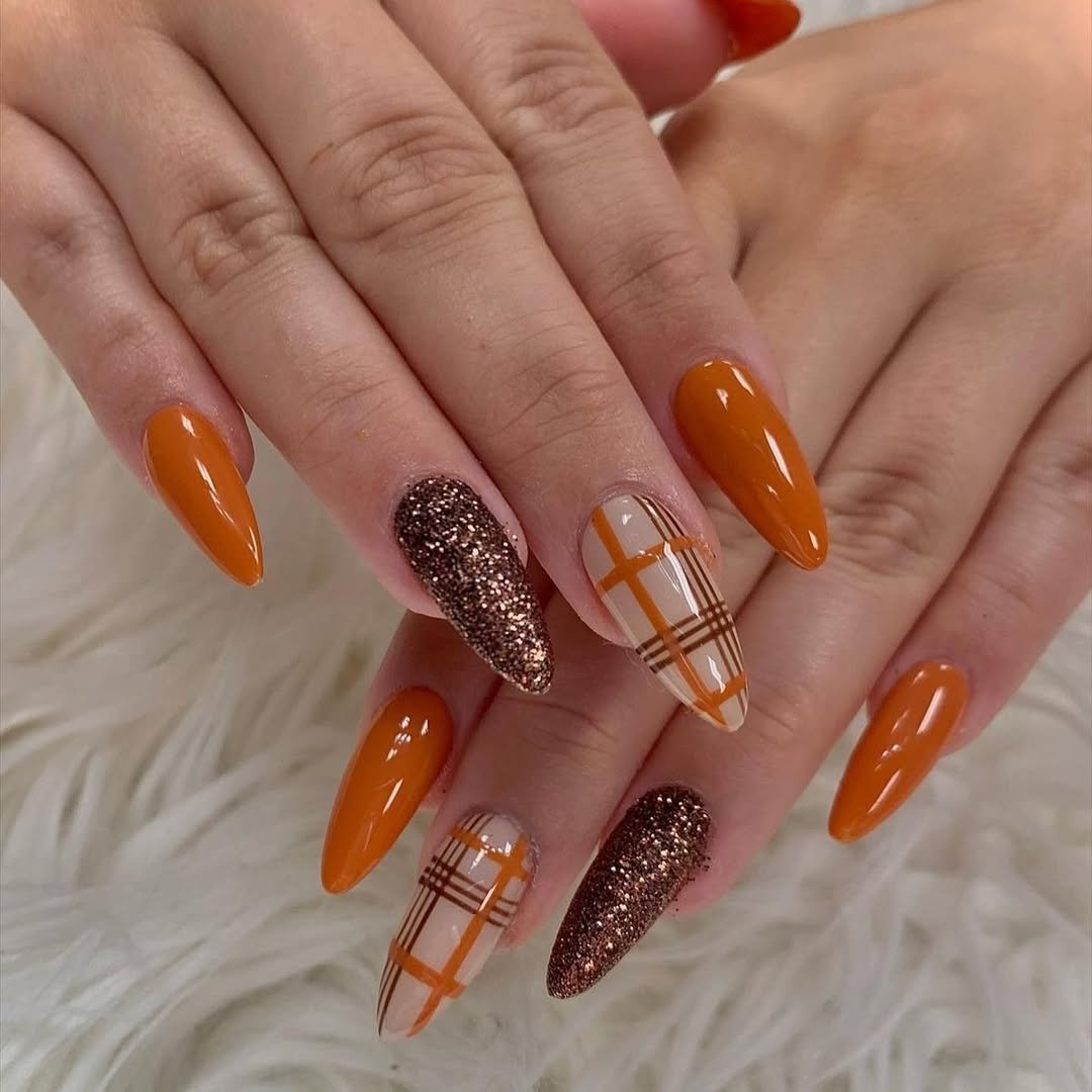 This manicure blends warm orange tones with cozy fall-inspired plaid patterns. The solid orange nails keep things bold, while the plaid design adds a playful seasonal twist.