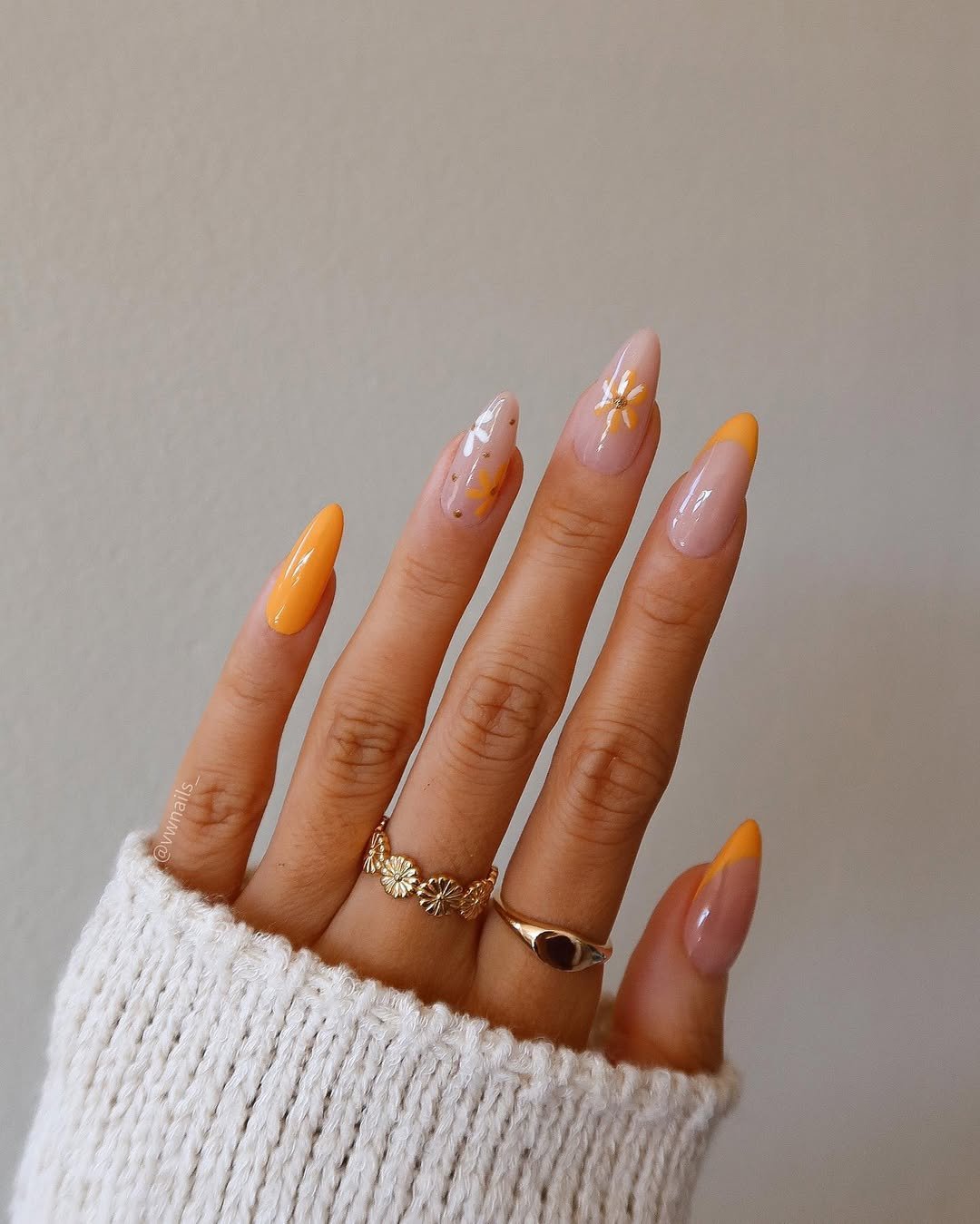 This set brings a soft, feminine twist to orange nails. The glossy nude base is paired with delicate yellow-orange tips and tiny daisy accents that feel fresh and playful.