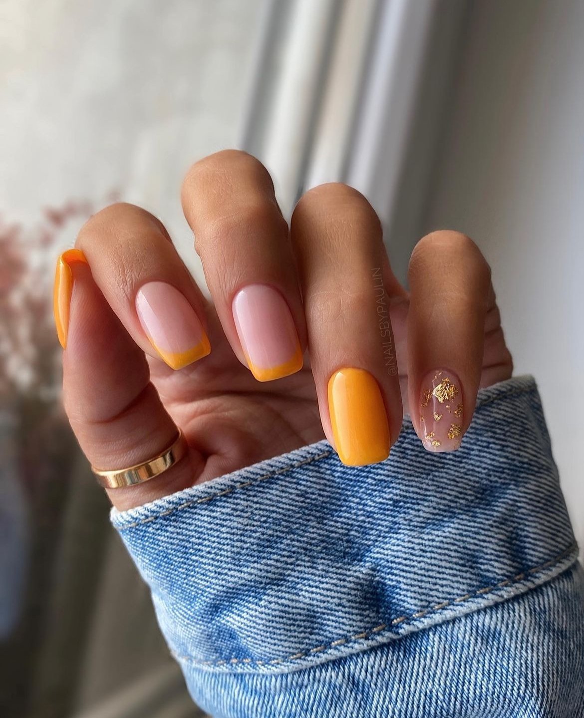 These nails balance bright color with soft elegance beautifully. The warm orange polish pairs perfectly with nude accent nails decorated with subtle gold foil details.