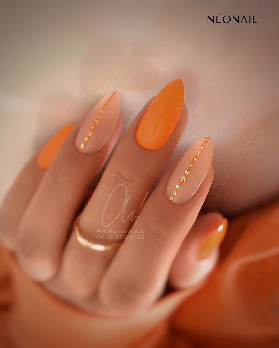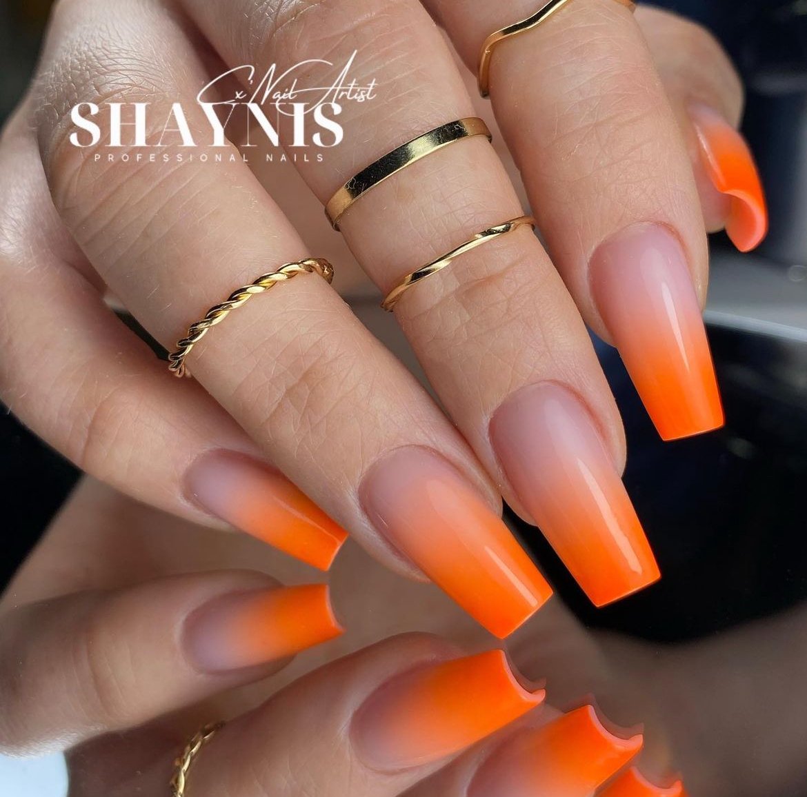 It’s bold without feeling chaotic. The warm orange base paired with the shimmer of gold makes the design feel both trendy and sophisticated at the same time.