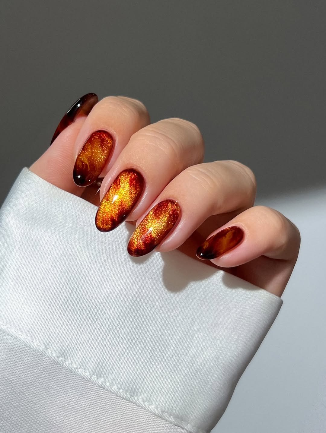 These nails look like they were dipped straight into liquid fire. The rich copper-orange shimmer catches the light from every angle, creating that molten metallic effect that feels both bold and hypnotic.