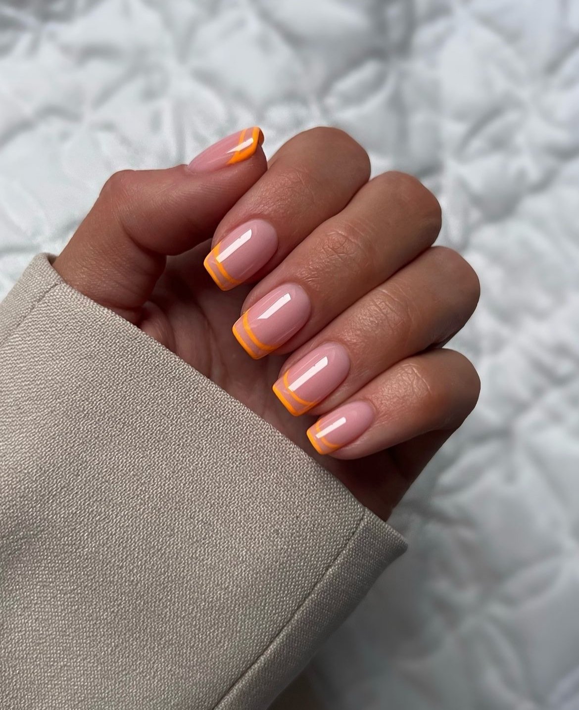 Here’s a fresh take on the classic French manicure. Instead of the usual white tips, this set swaps them for bold neon orange lines that instantly brighten the entire look.