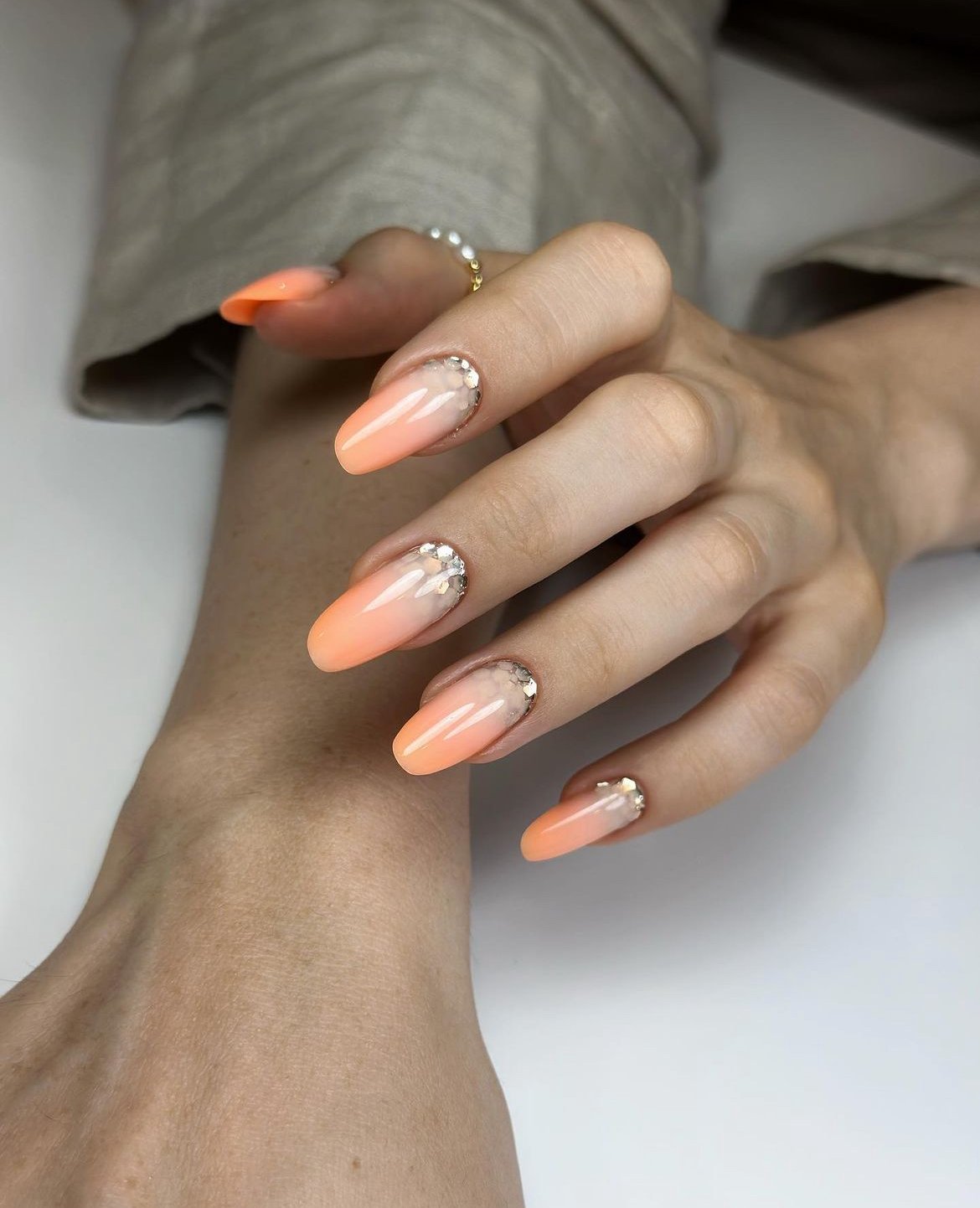 This set is pure soft-glam energy. The peachy ombré base fades beautifully from nude to a warm citrus tone, giving the nails a smooth, dreamy gradient.