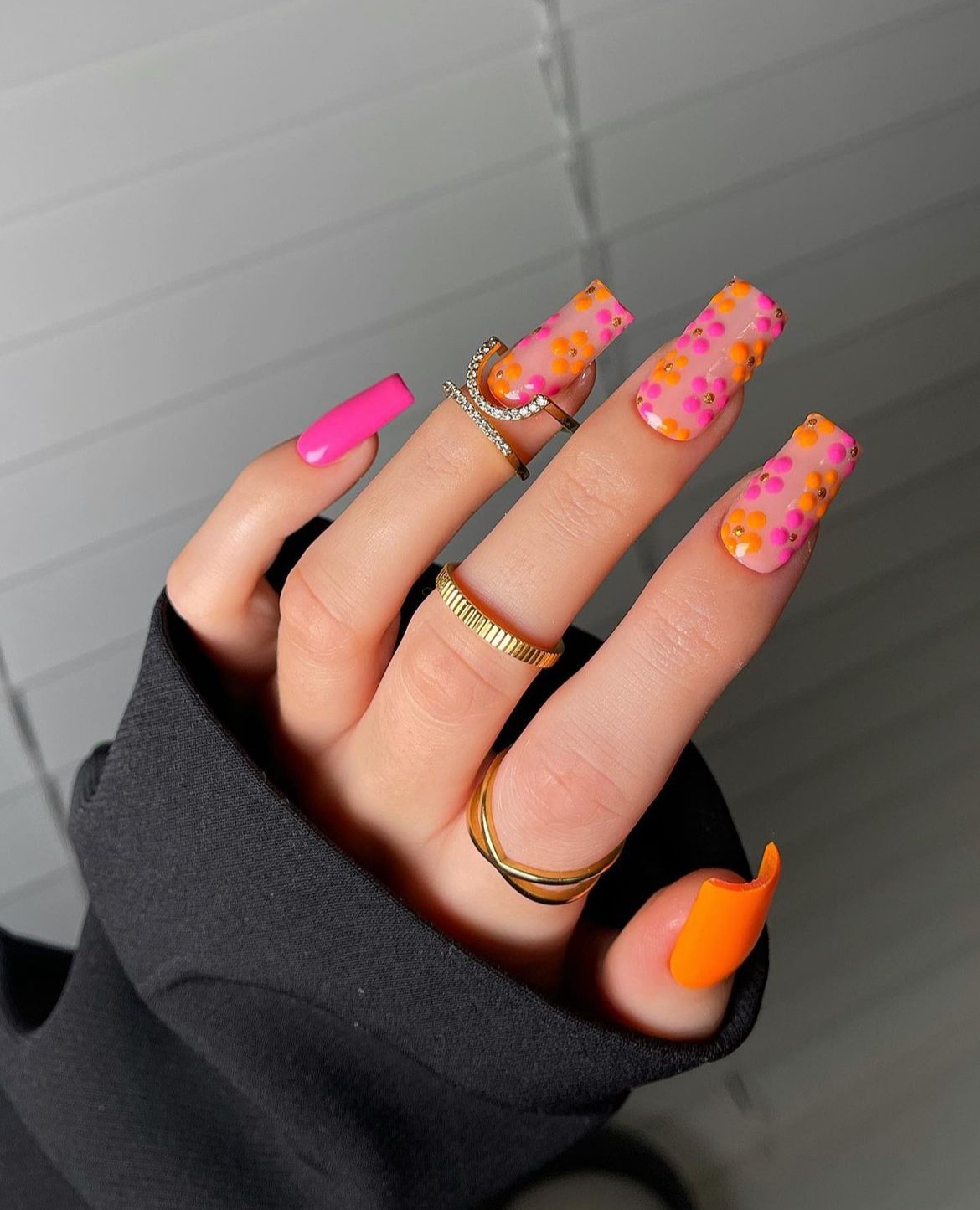 This set feels like a little party on your fingertips. Bright pink nails are paired with playful orange and pink dot patterns, creating a cheerful design that instantly catches the eye.