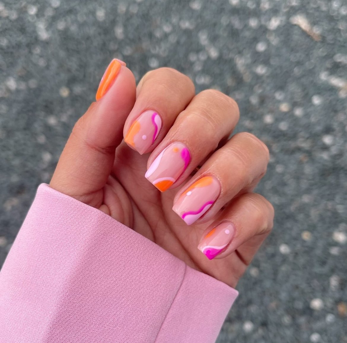 This design brings a fun splash of color with abstract waves in pink and orange dancing across a nude base. The shapes feel fluid and playful, almost like tiny paint strokes on each nail.