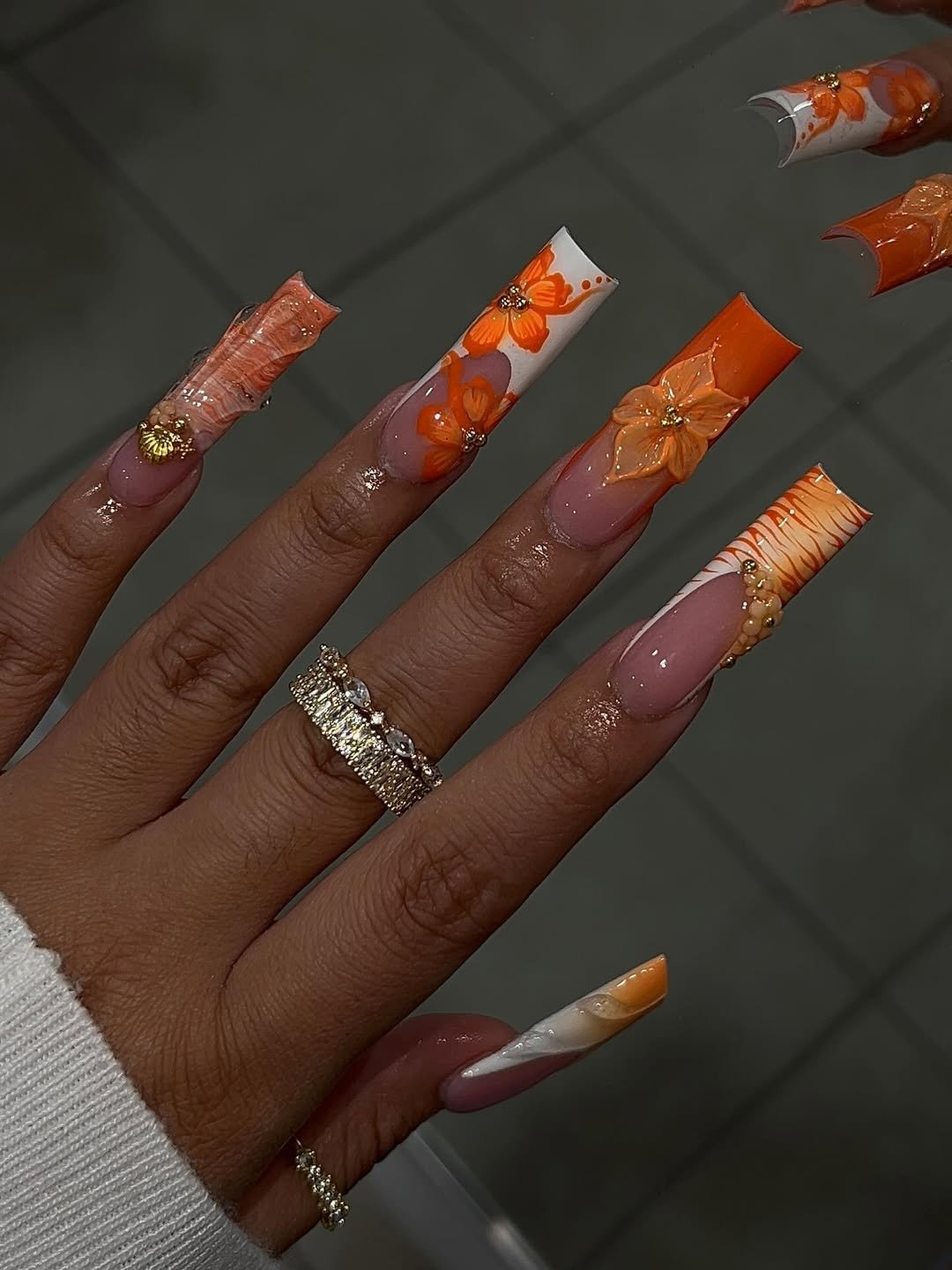 This set is pure statement energy. Long square tips become the canvas for layered orange florals, glossy marbling, and sculpted 3D petals that almost look like tiny pieces of jewelry. Every nail feels intentionally different, yet the warm orange palette ties the whole design together beautifully.