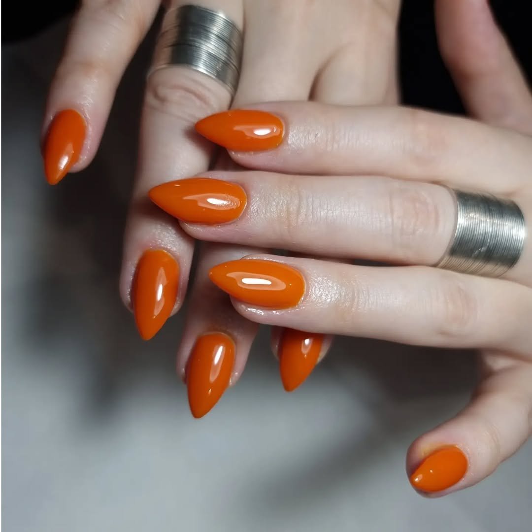 This set leans into a smooth almond shape with a rich orange polish that looks incredibly sleek. The shine is flawless, making the color appear even deeper and more vibrant.