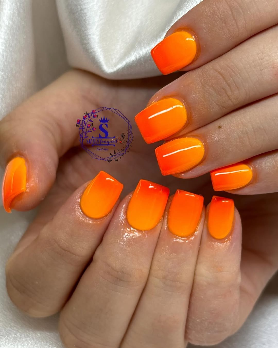 These nails capture that golden-hour glow perfectly. The smooth gradient fades from bright citrus orange into a softer warm tone, creating a manicure that looks almost like a sunset melting across the nails.