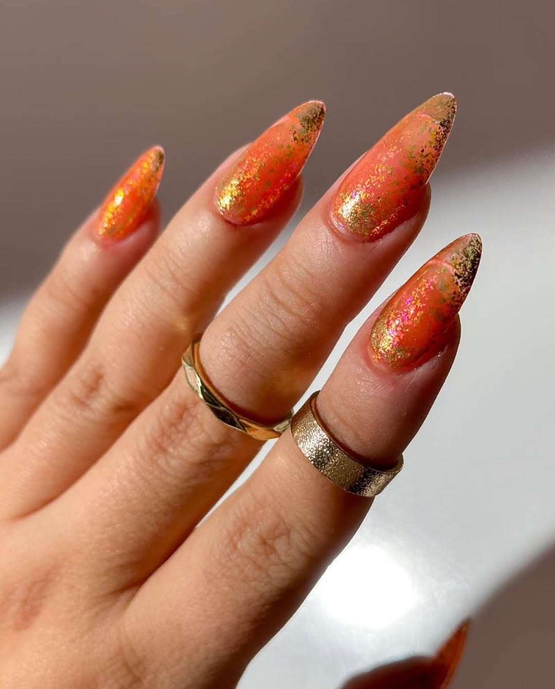 This mani is proof that orange doesn’t have to be heavy — it can glow, sparkle, and dance in the light while still feeling seasonal.