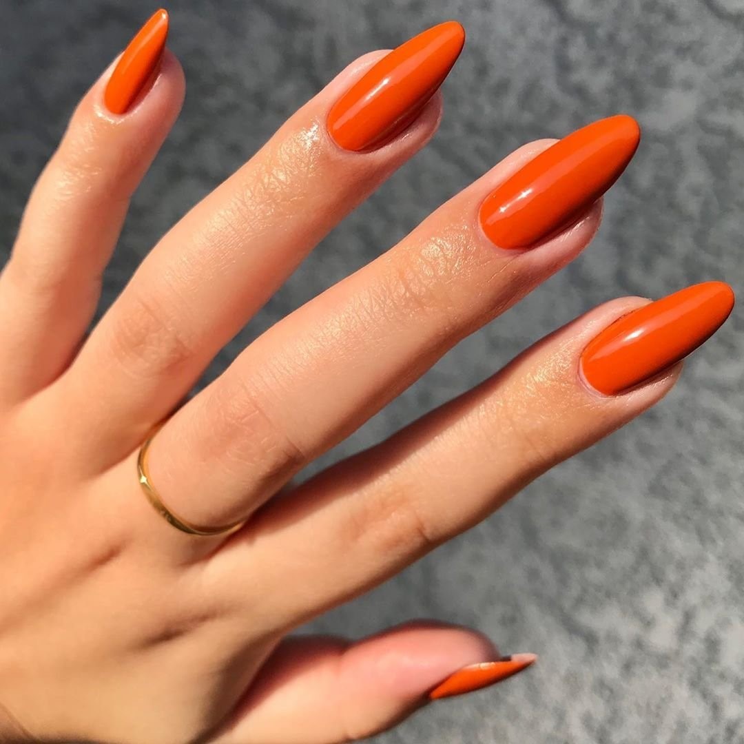 If you want a manicure that radiates energy, this is it. That glossy, juicy orange practically glows — like the last sunset of autumn before winter hits. The stiletto shape adds drama, making the color pop even more.