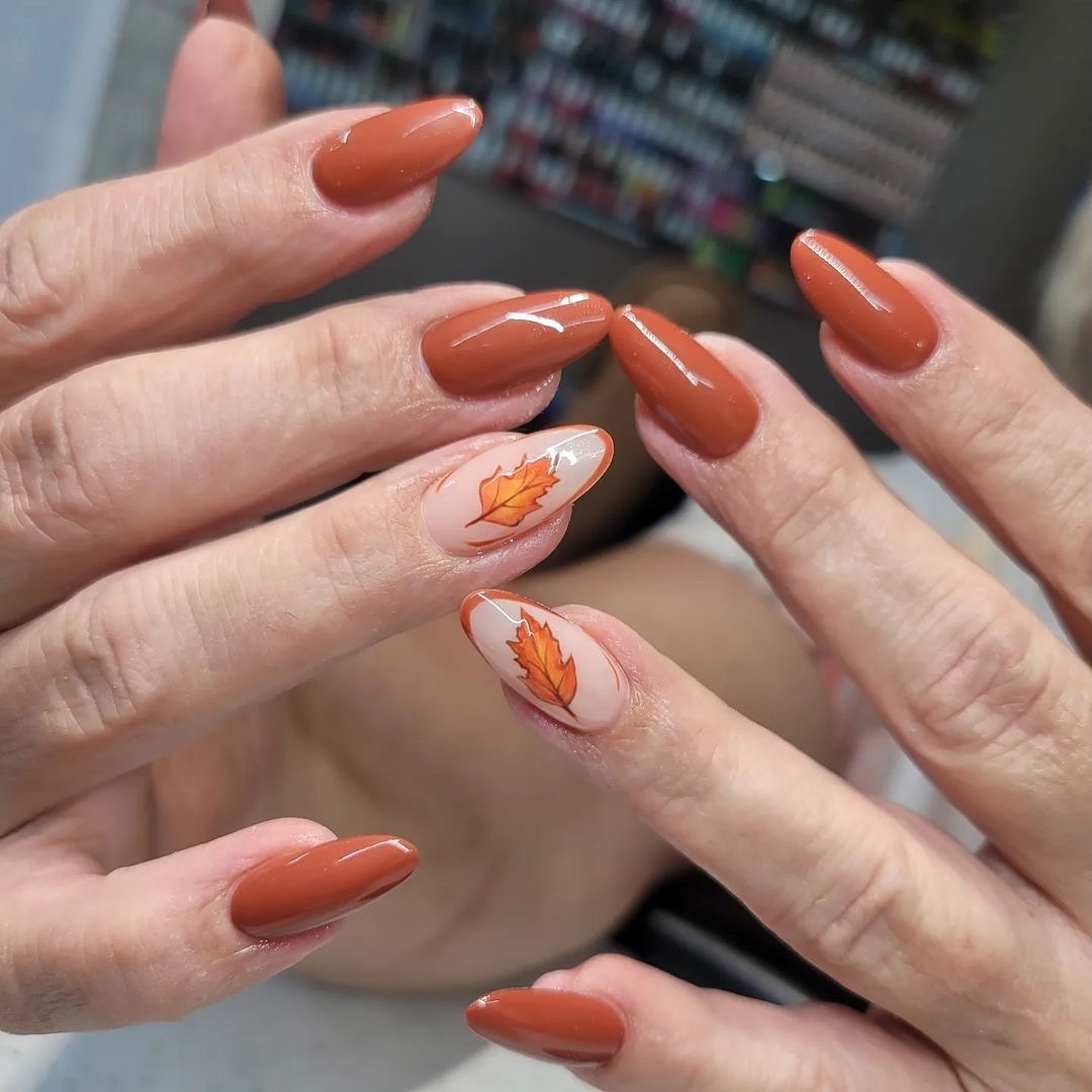 This design takes cozy simplicity and adds the perfect touch of charm. The burnt orange nails are smooth and glossy, while the leaf accent nails give it just enough detail to stand out. It’s giving “autumn afternoon stroll” energy.