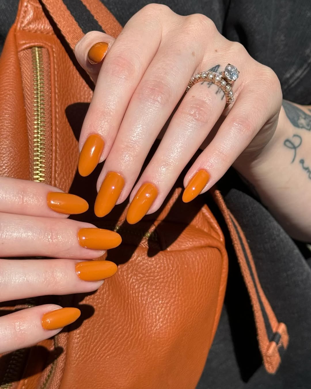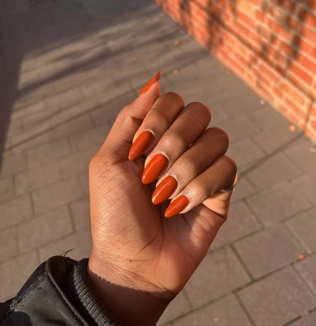 This warm burnt-orange shade is autumn perfection in a bottle. The sleek almond shape gives it that effortlessly polished look — like a cozy sweater, but for your hands. It’s rich, saturated, and glows in the sunlight just enough to catch every eye on your pumpkin-spice-latte run.