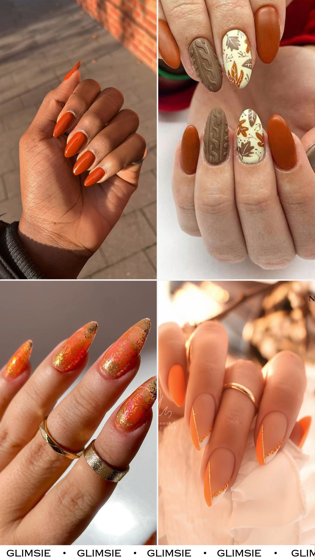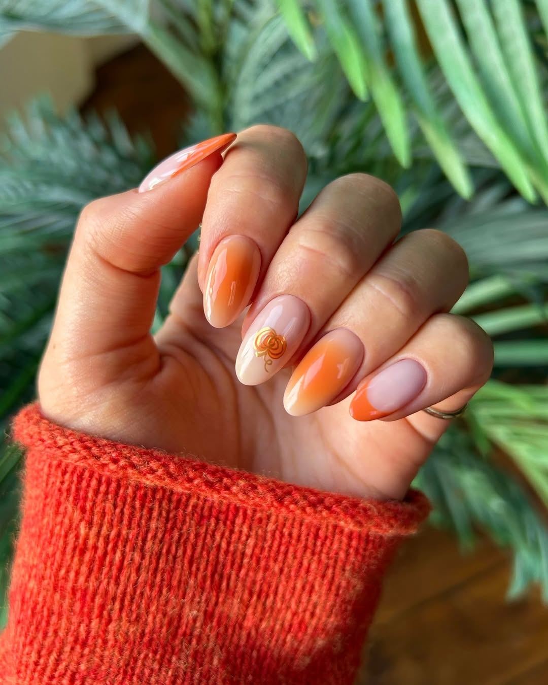 This one’s got all the right fall tones in one dreamy combo. From metallic oranges to creamy nudes with gold foil accents, it’s basically Thanksgiving on your fingertips — but make it polished. The gradient of warm shades creates depth and personality without feeling overdesigned.
