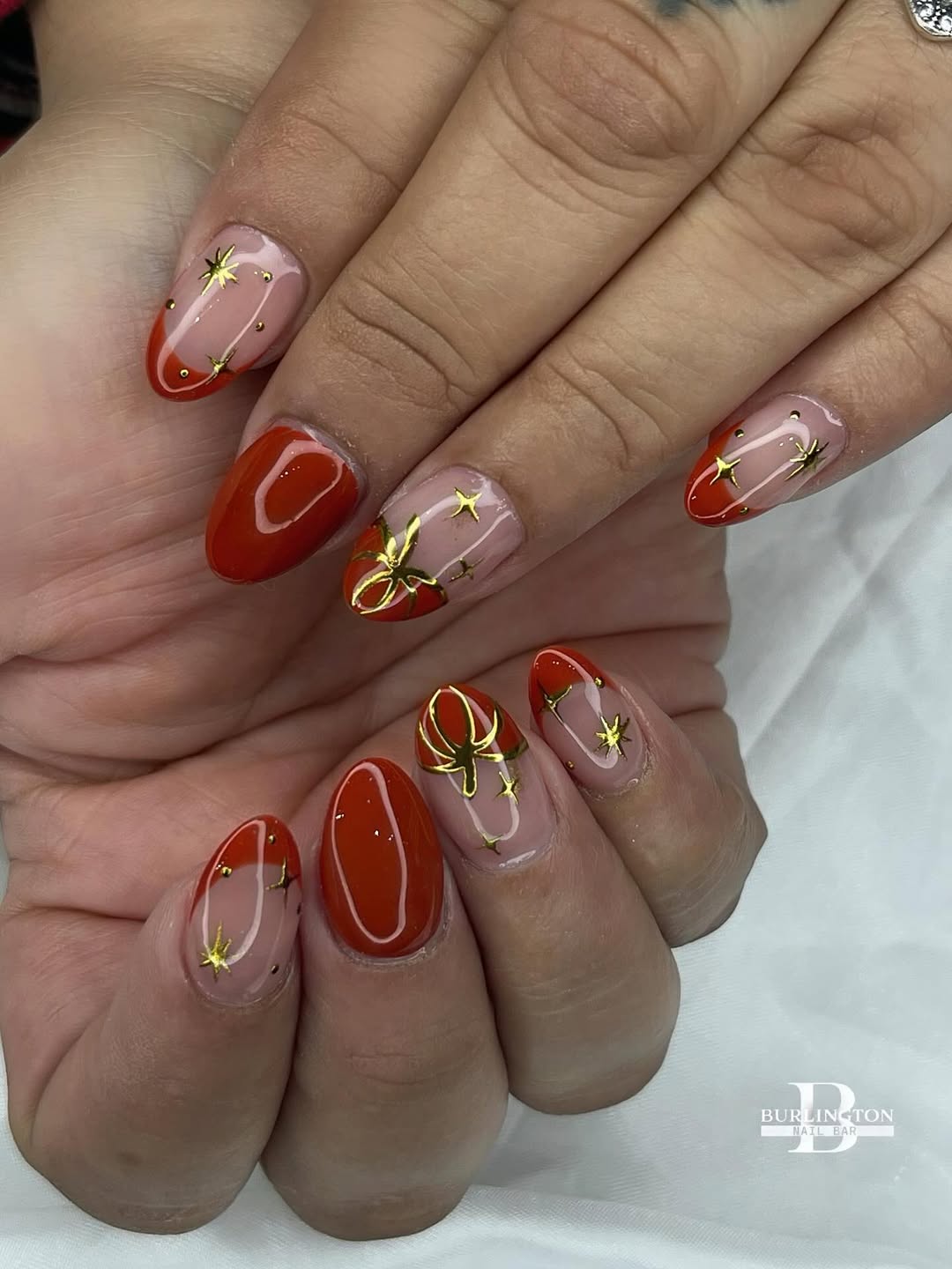 We’re obsessed with this playful twist on a French manicure. The bright orange tips with gold celestial accents make it festive without feeling overdone. It’s like a mix of harvest warmth and a hint of holiday sparkle.