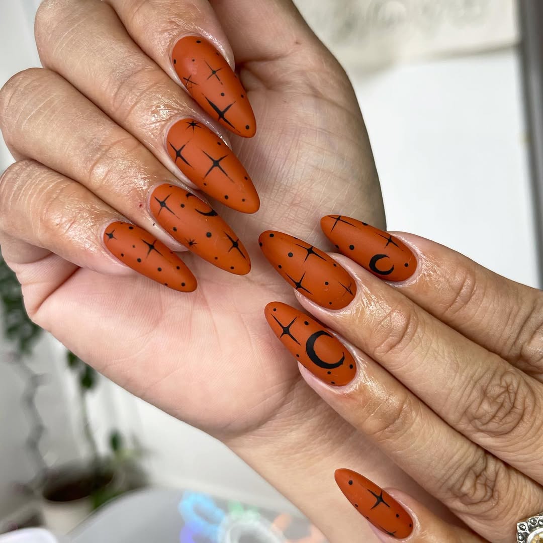 The fine line work — tiny stars, dots, and pumpkins — adds a delicate detail that catches the light just right. There’s something about this balance between nude base and fiery orange that feels effortlessly elegant.
