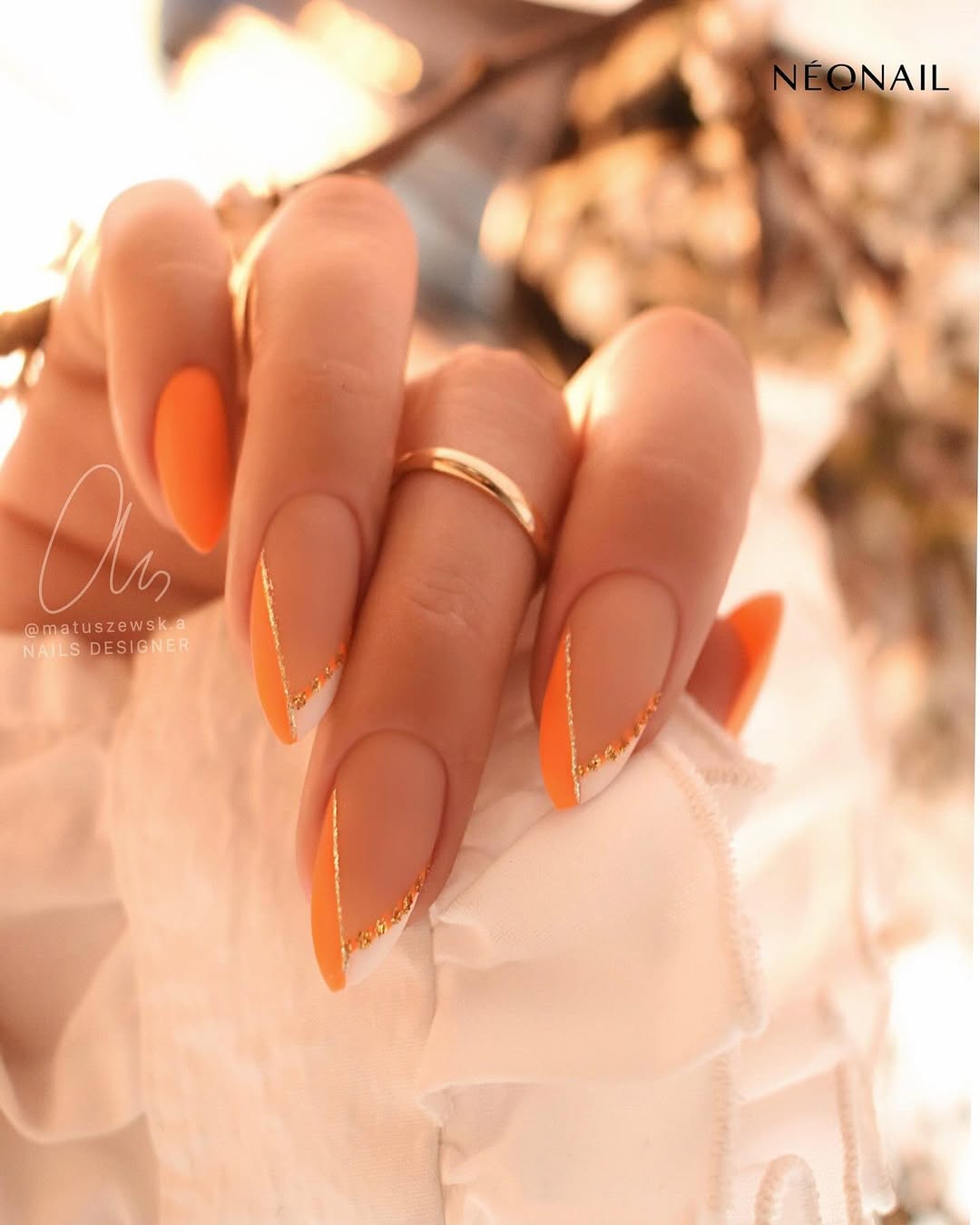 Soft matte orange meets minimal gold detailing — a combo that feels elevated yet easygoing. The diagonal tips and fine gold lines bring a modern edge to the otherwise cozy shade, keeping it chic and balanced.