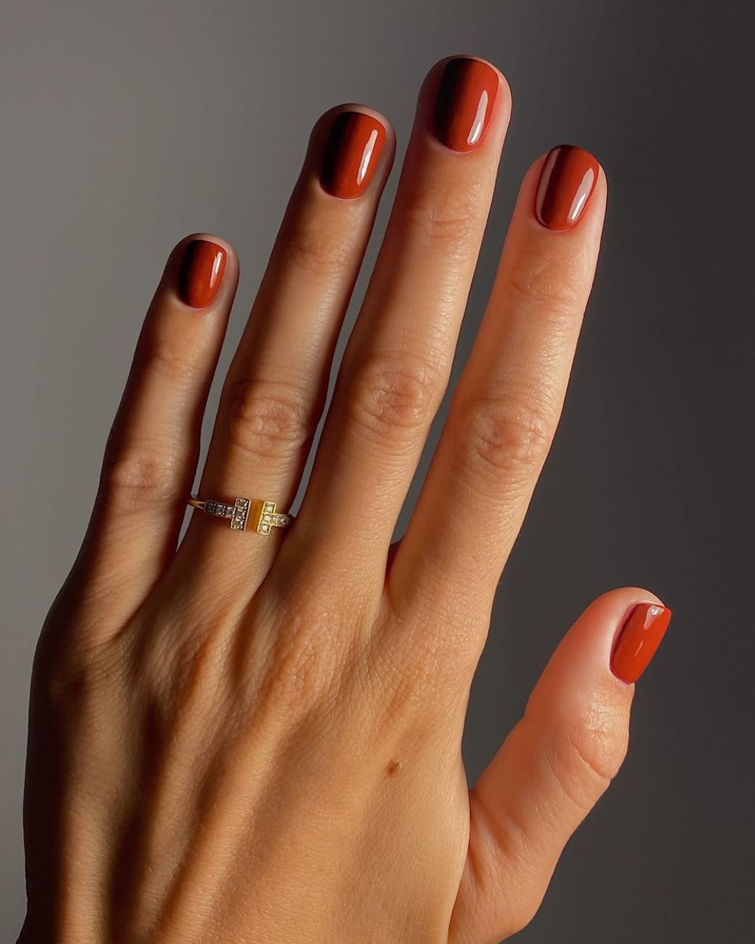 @scratchmagazine takes “short nails, strong statement” to heart with this burnt cinnamon look. The deep orange-brown tone gives off sophisticated pumpkin spice vibes — warm, rich, and totally wearable.