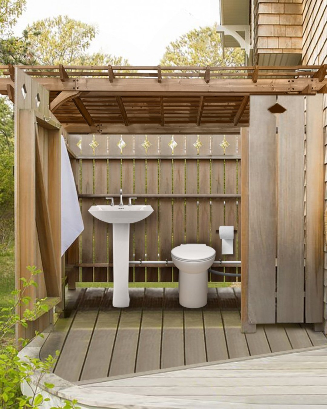 Okay, this one is giving “practical but make it cute.” A simple deck setup with a sink and toilet, framed by warm wood and a slatted fence that lets just enough greenery peek through. It’s functional, yes—but it doesn’t forget to feel good while doing it.