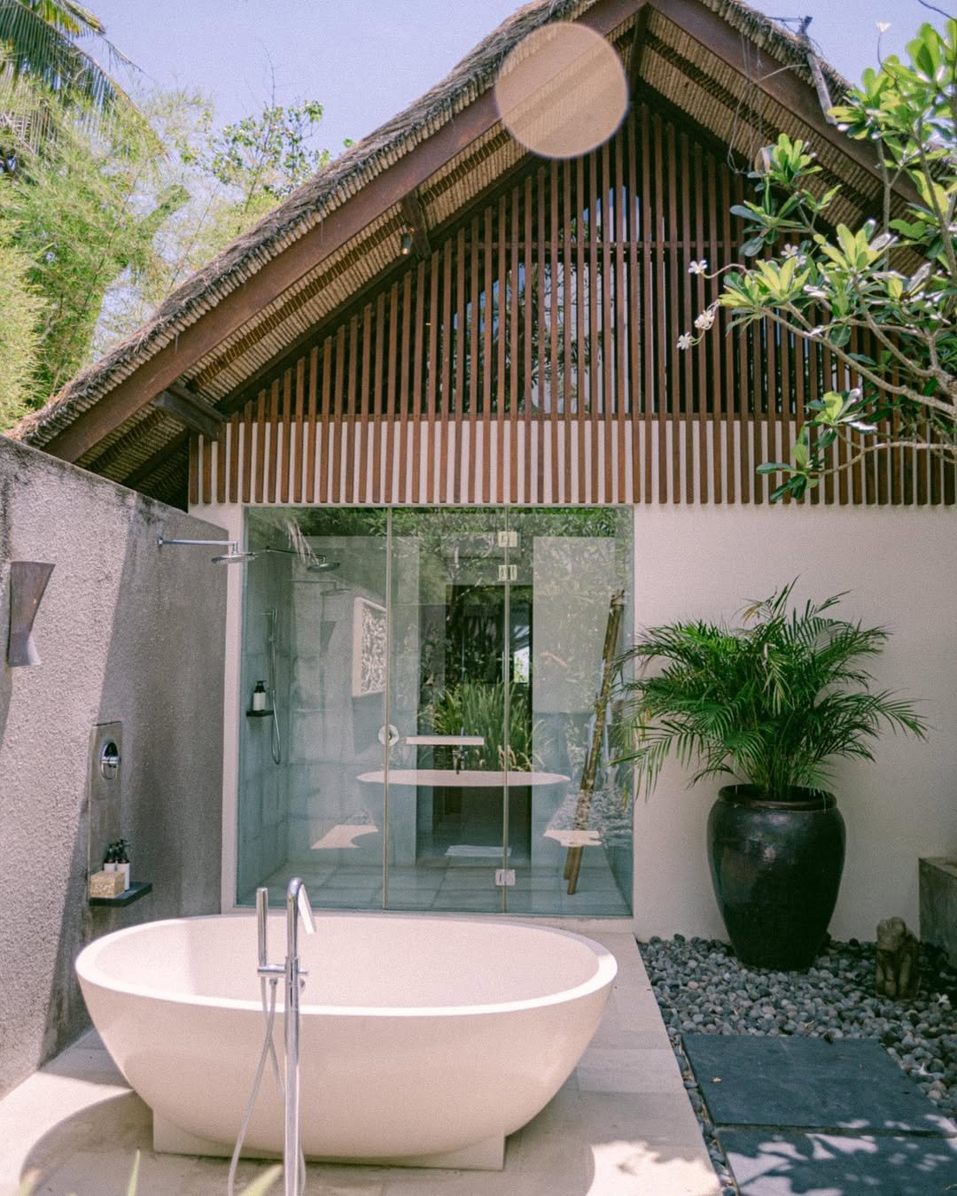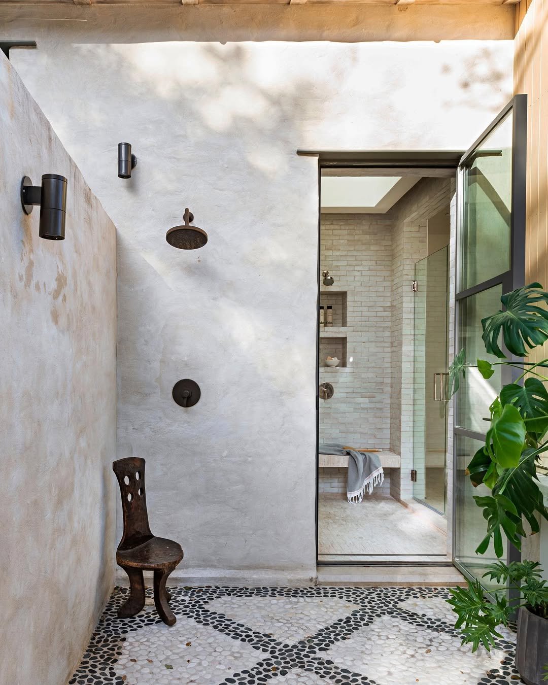 This one feels like a quiet exhale. Soft plaster walls, that pebble flooring detail, and the seamless transition into the indoor shower—it’s all very understated, but incredibly intentional. Nothing flashy, just calm textures doing their thing.
