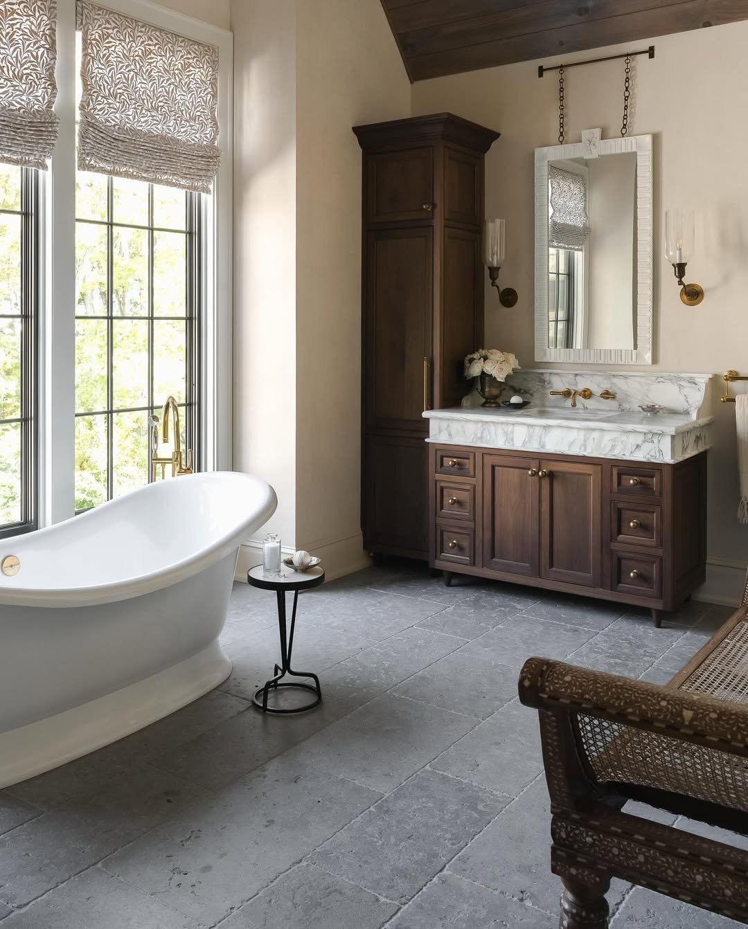 This is where things shift into timeless luxury. The freestanding tub, marble vanity, and warm wood cabinetry—it’s polished, refined, and beautifully balanced.