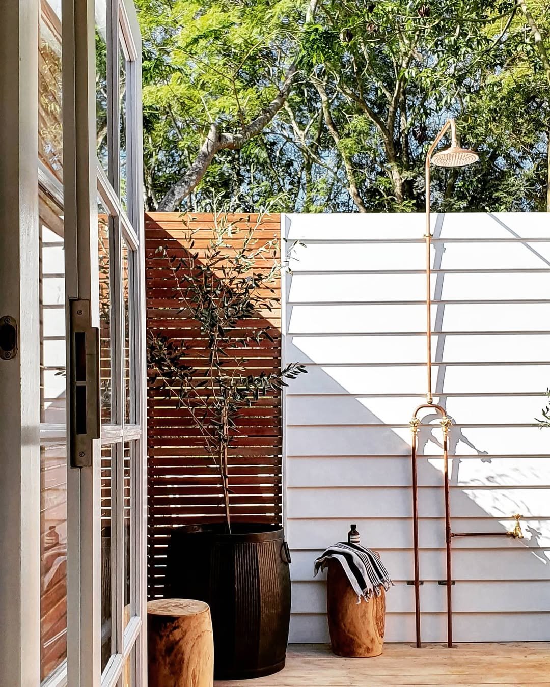 This space feels like sunshine captured in a room. The open top, white slatted fencing, and soft greenery create a bright, airy vibe that instantly lifts your mood. And that brass shower fixture? Such a warm, subtle detail.